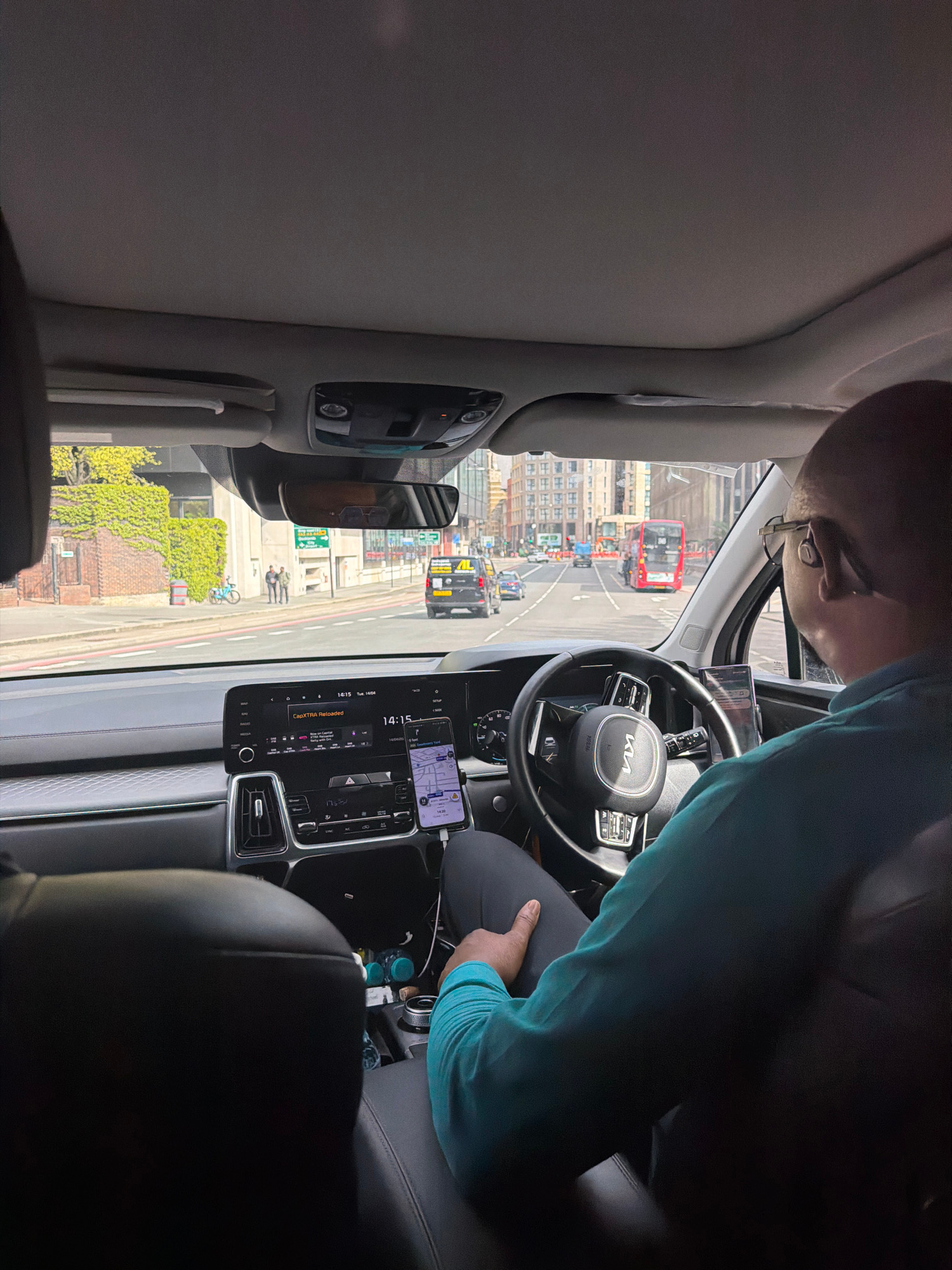 The interior of a Kia Sorento is presented from the passenger's point of view. The driver, a bald man with glasses and wearing a light blue shirt, is seen. The dashboard features a central display sho…read more