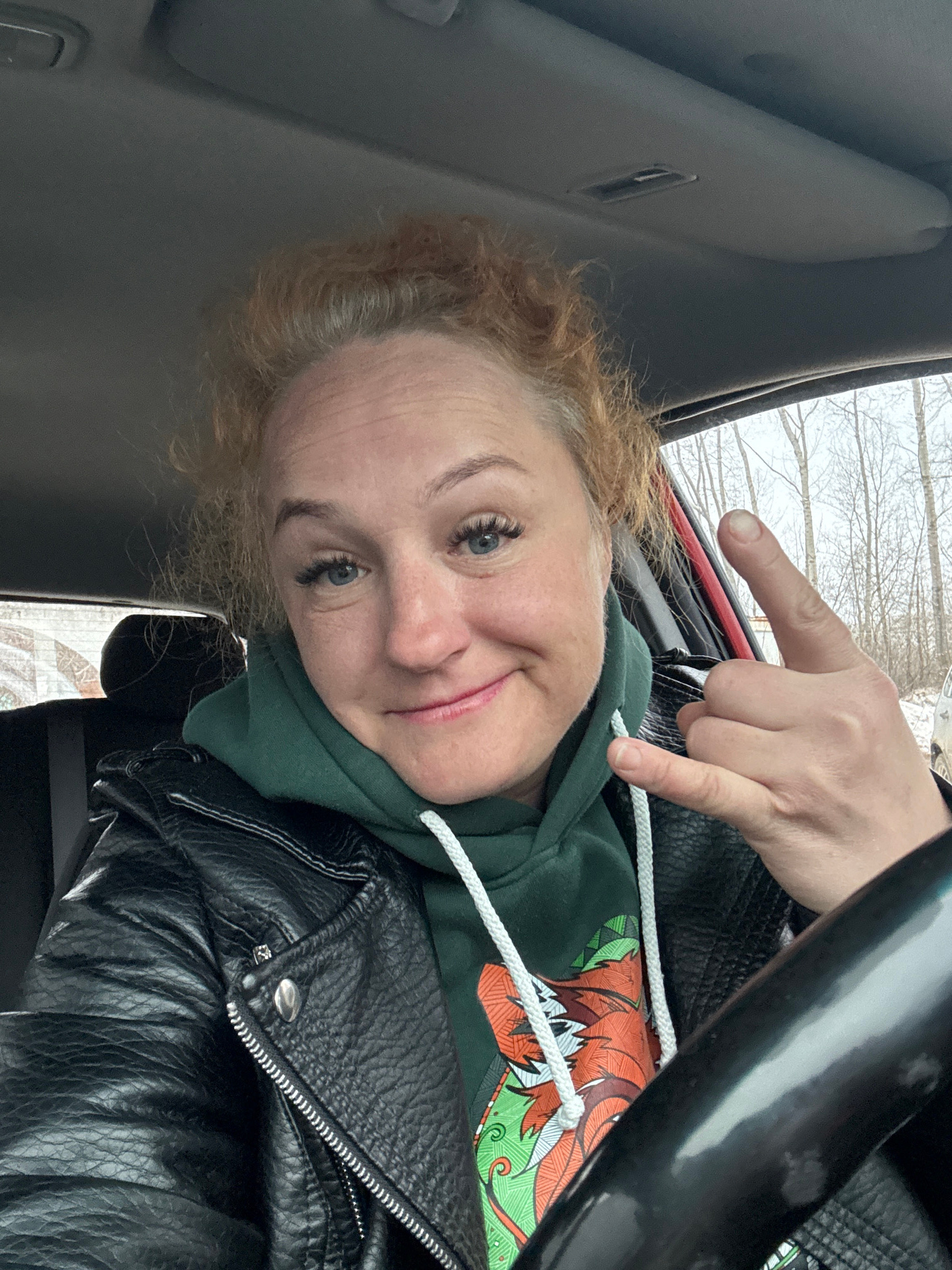 A person with red hair is sitting in a vehicle, wearing a green hoodie under a black leather jacket. They are making a hand gesture with their right hand. The environment outside appears to be wintery…read more