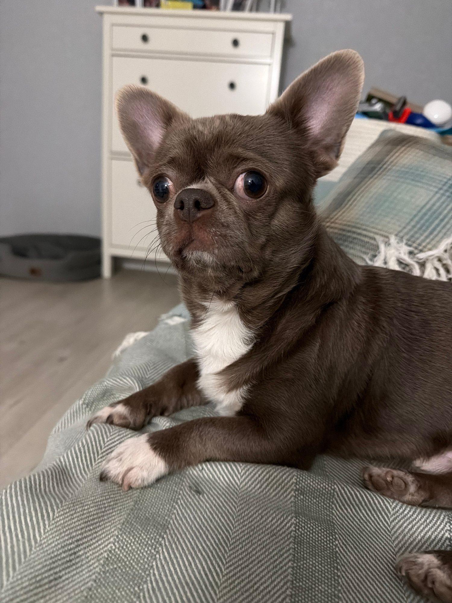 A brown and white Chihuahua-like dog is resting on a herringbone-patterned green and white blanket. The dog is positioned to the right and tilted so that its head is facing the lower left corner of th…read more