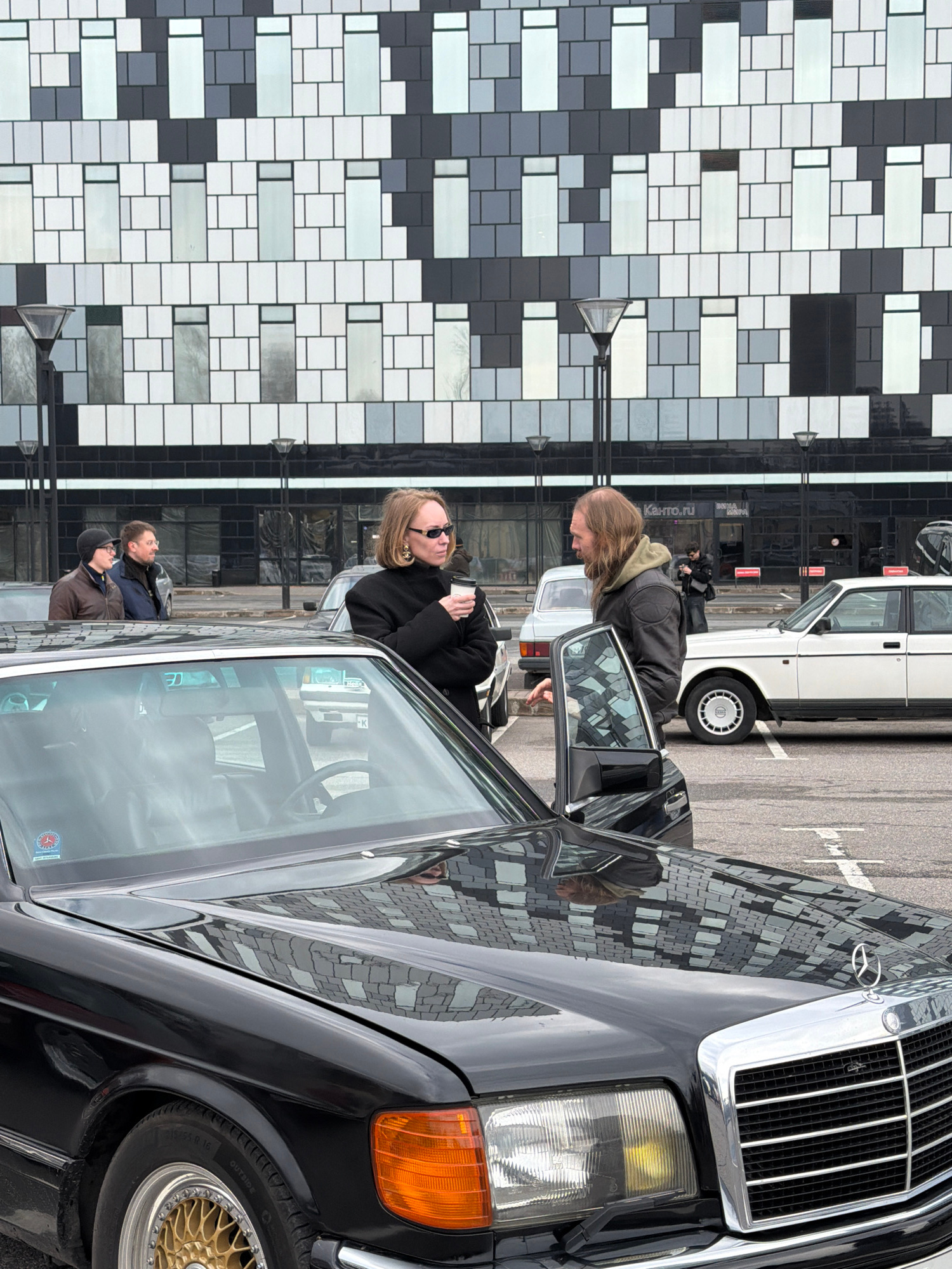 The image shows a black Mercedes-Benz parked on a street in Saint Petersburg, Russia. Two people are standing near the open driver's side door of the car. One person, a woman with short blonde hair an…read more