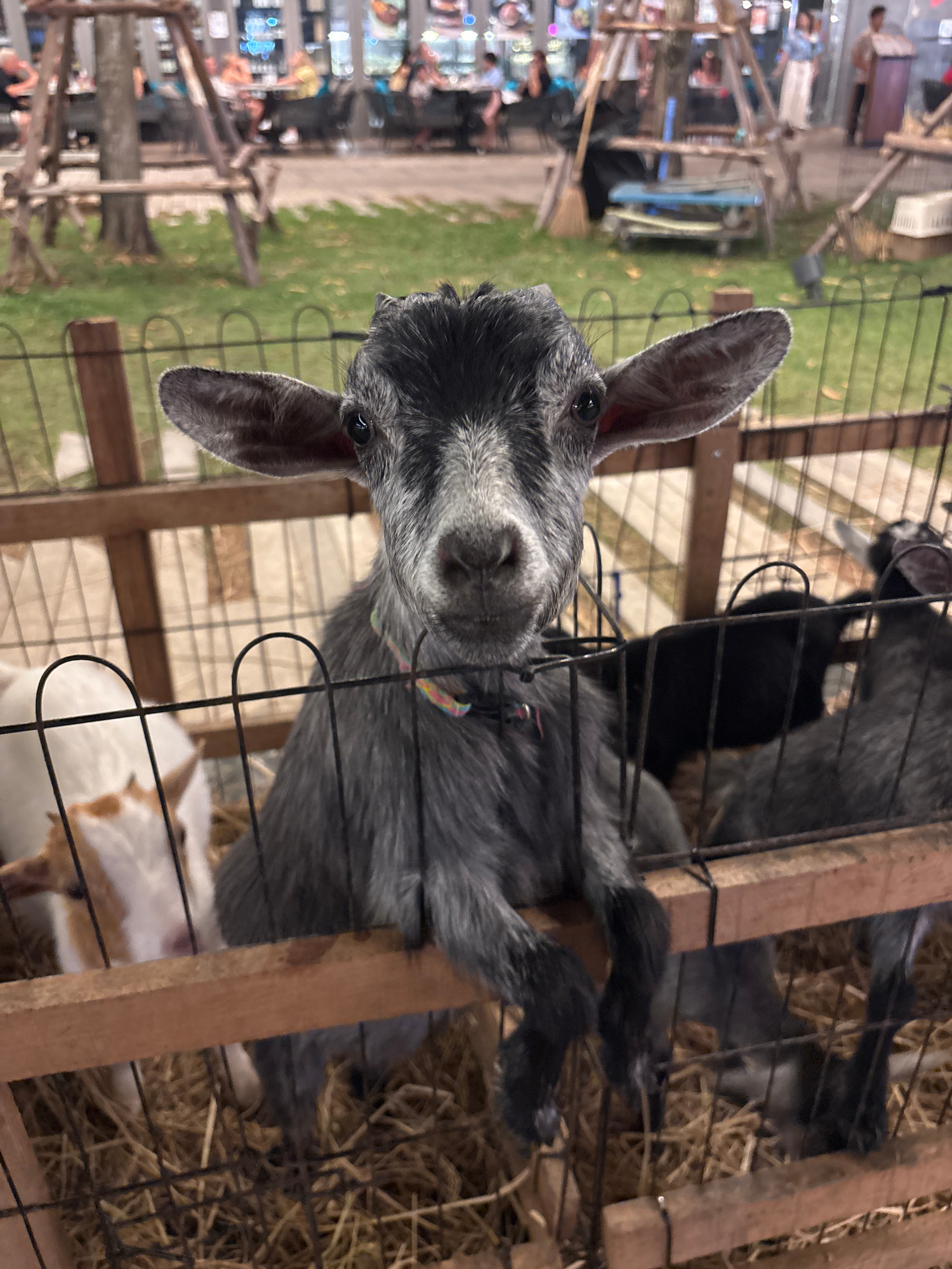 A gray goat with large ears peers through a metal and wooden fence in Choeng Thale, Thailand. The enclosure contains hay and other goats, one with a white and tan coat. Outside the fence, on the left…read more