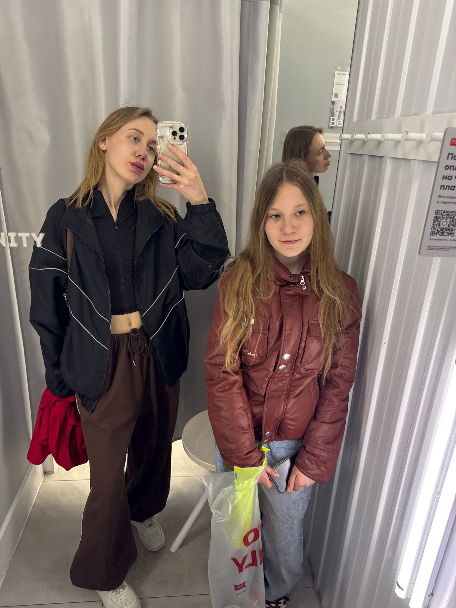 Here is a forensic description of the image. **Scene:** The image appears to be taken inside a fitting room, possibly in a retail clothing store. The walls of the fitting room are white, with a horizβ¦read more
