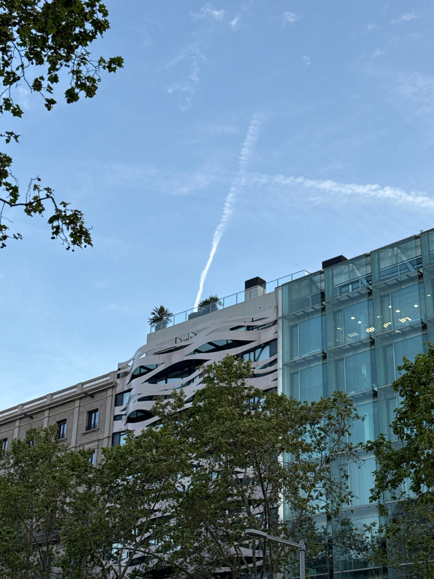 A low-angle shot shows a tall building in Barcelona, Spain. The top portion features glass panels. The lower portion exhibits a white, swirling design. Green trees partially obscure the building. A fa…read more