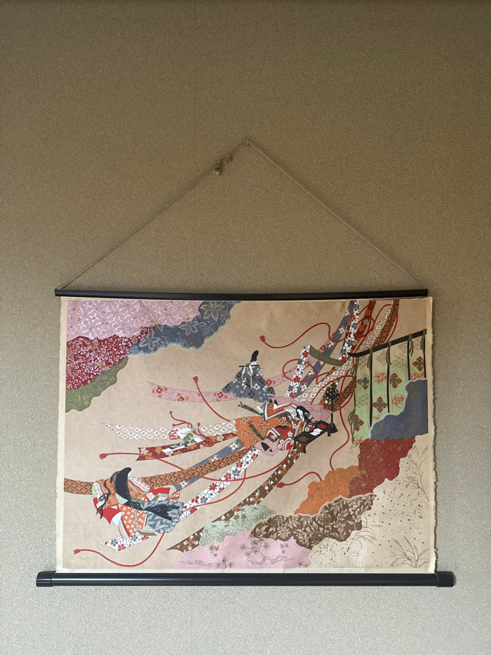 An artwork is centrally mounted on a textured, light brown wall in Nozawaonsen, Japan. The artwork, a print or painting on tan paper with slightly rough edges, depicts three stylized figures in tradit…read more