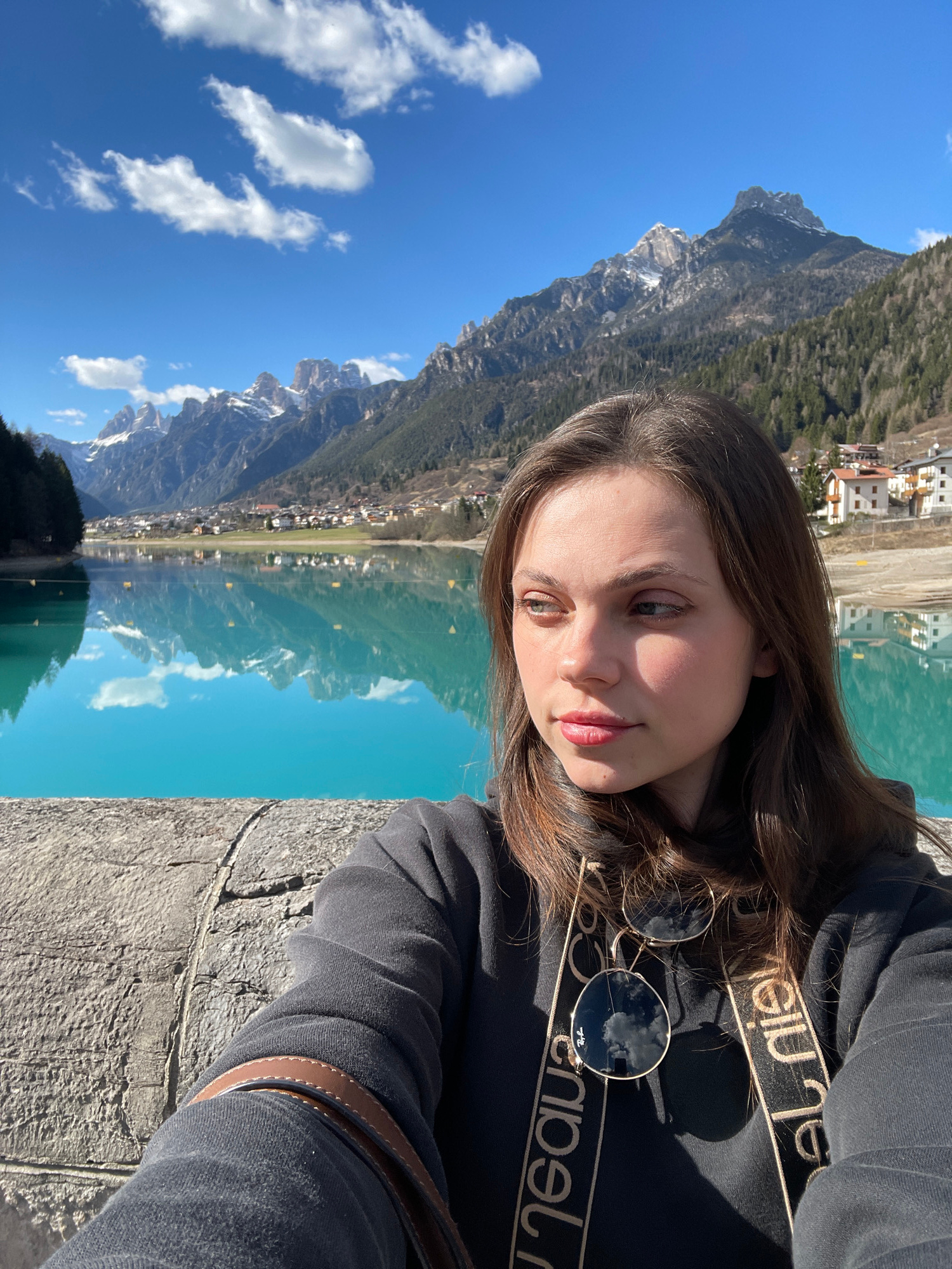A vertically-oriented medium shot features a young woman in the foreground, with a picturesque landscape visible in the background. The woman has long brown hair, fair skin, and is wearing a black swe…read more