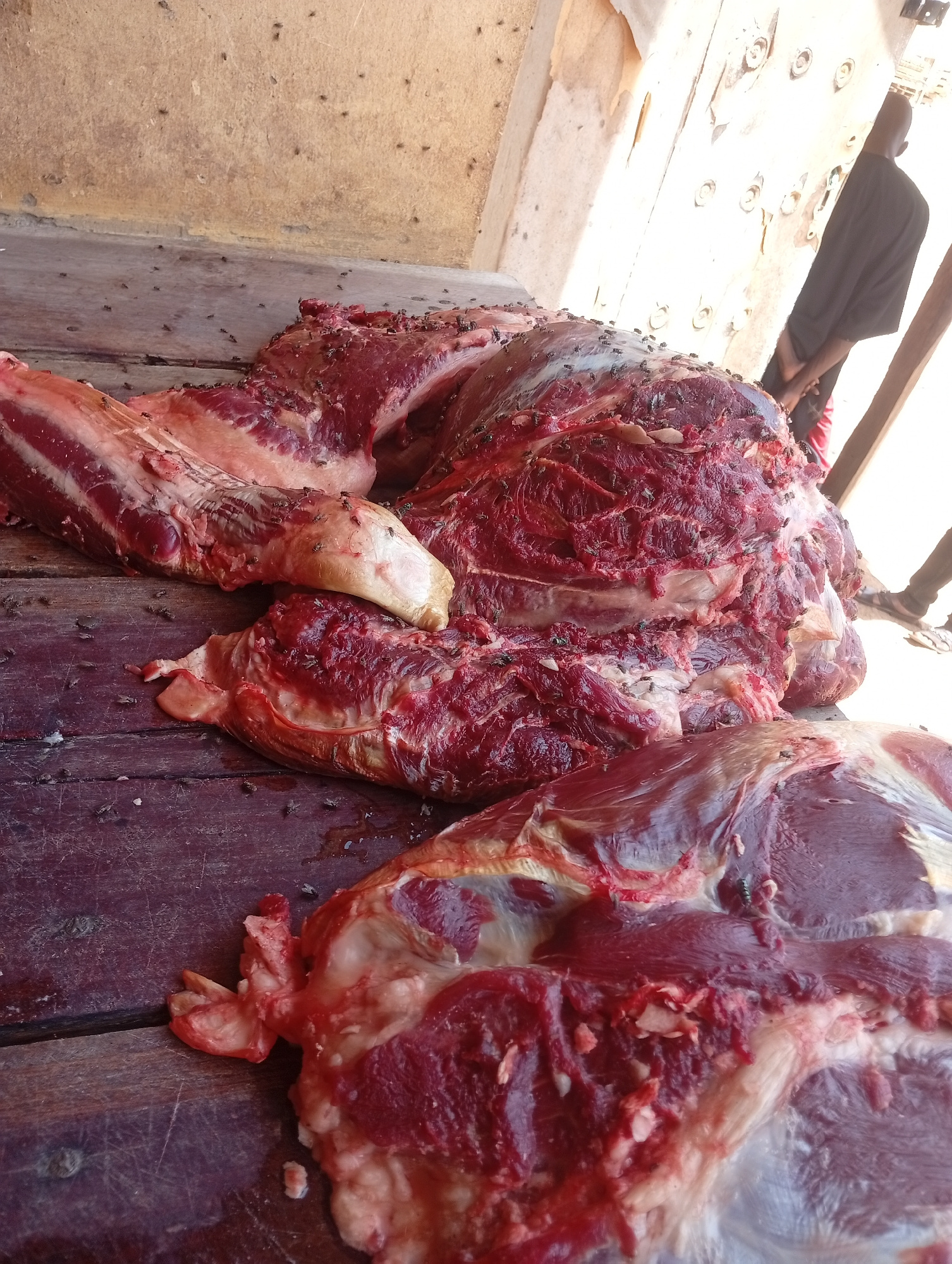 In Barnawa, Nigeria, cuts of raw meat lie on a wooden surface. The meat is heavily covered in flies. A person in dark clothing stands in the background.