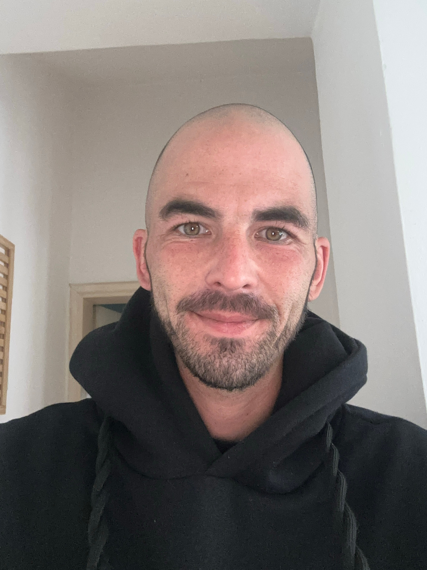 A light-skinned man with a shaved head and a short beard is facing the camera. He is wearing a black hooded sweatshirt. The background consists of a white wall. The location, Budva, Montenegro, cannot…read more