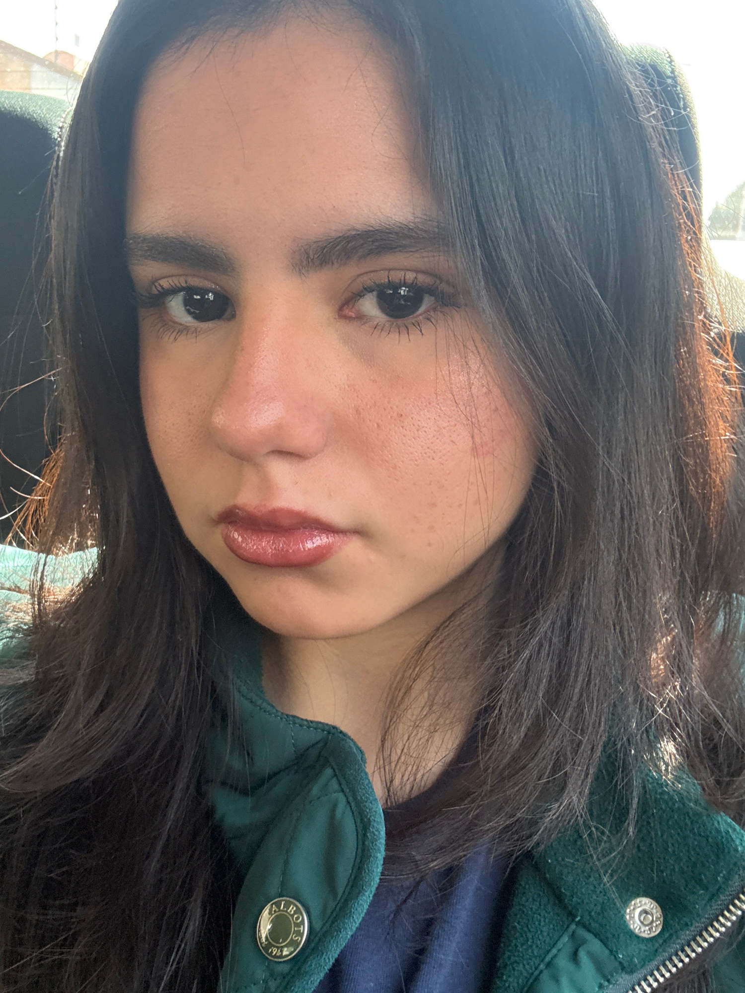 A close-up, slightly rotated, selfie portrait of a woman with long, dark hair. She has fair skin and dark eyes, with notable eyebrows. She is wearing a dark green jacket with a button labeled "TALBOTSβ¦read more