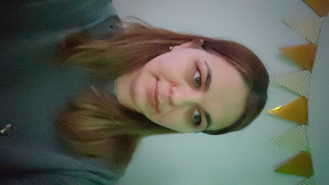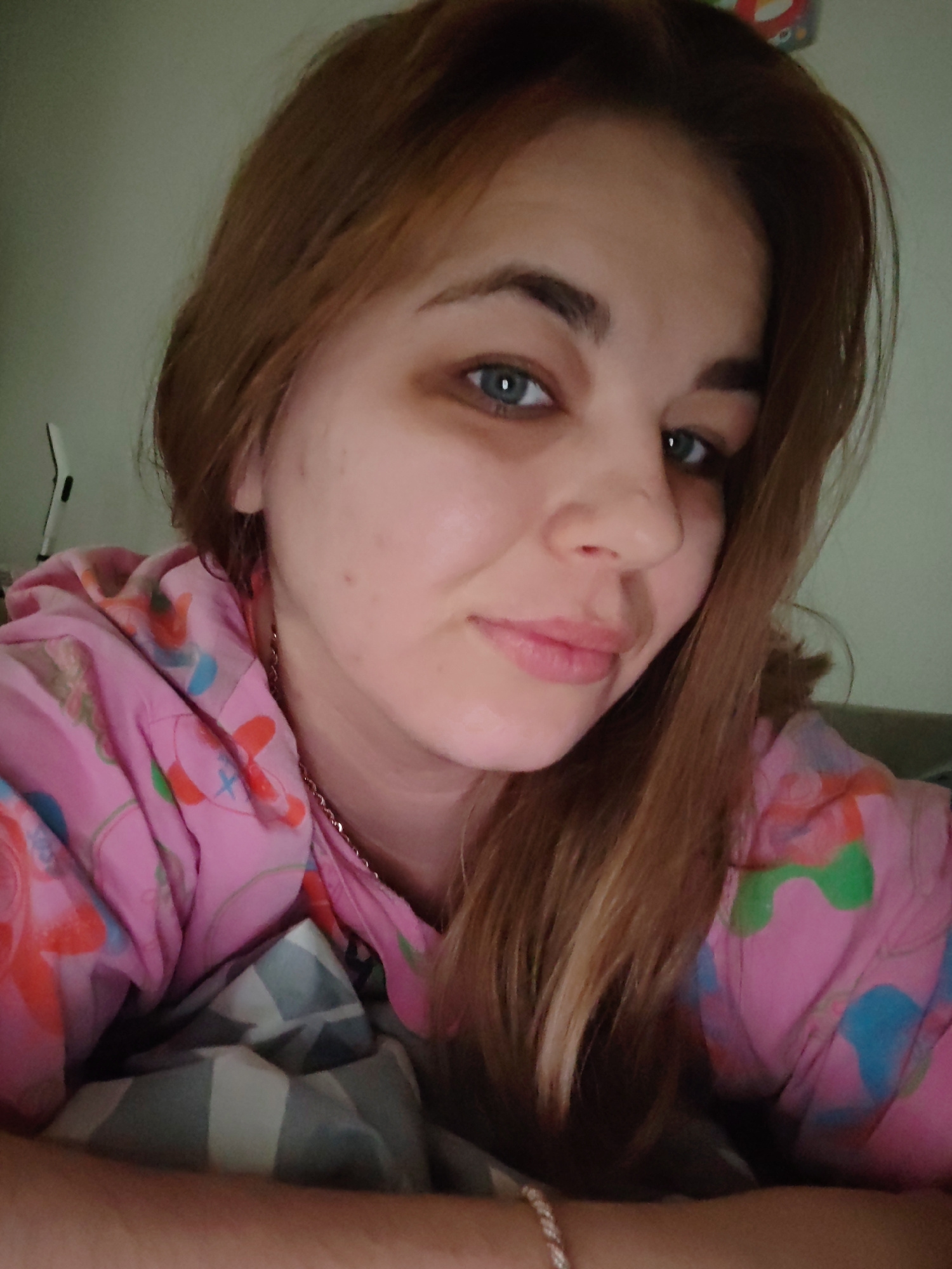 A woman is shown in a close-up selfie. She is wearing a pink patterned top and lies on a pillow with a grey and white geometric pattern. The background is indistinct and appears to be indoors. The loc…read more