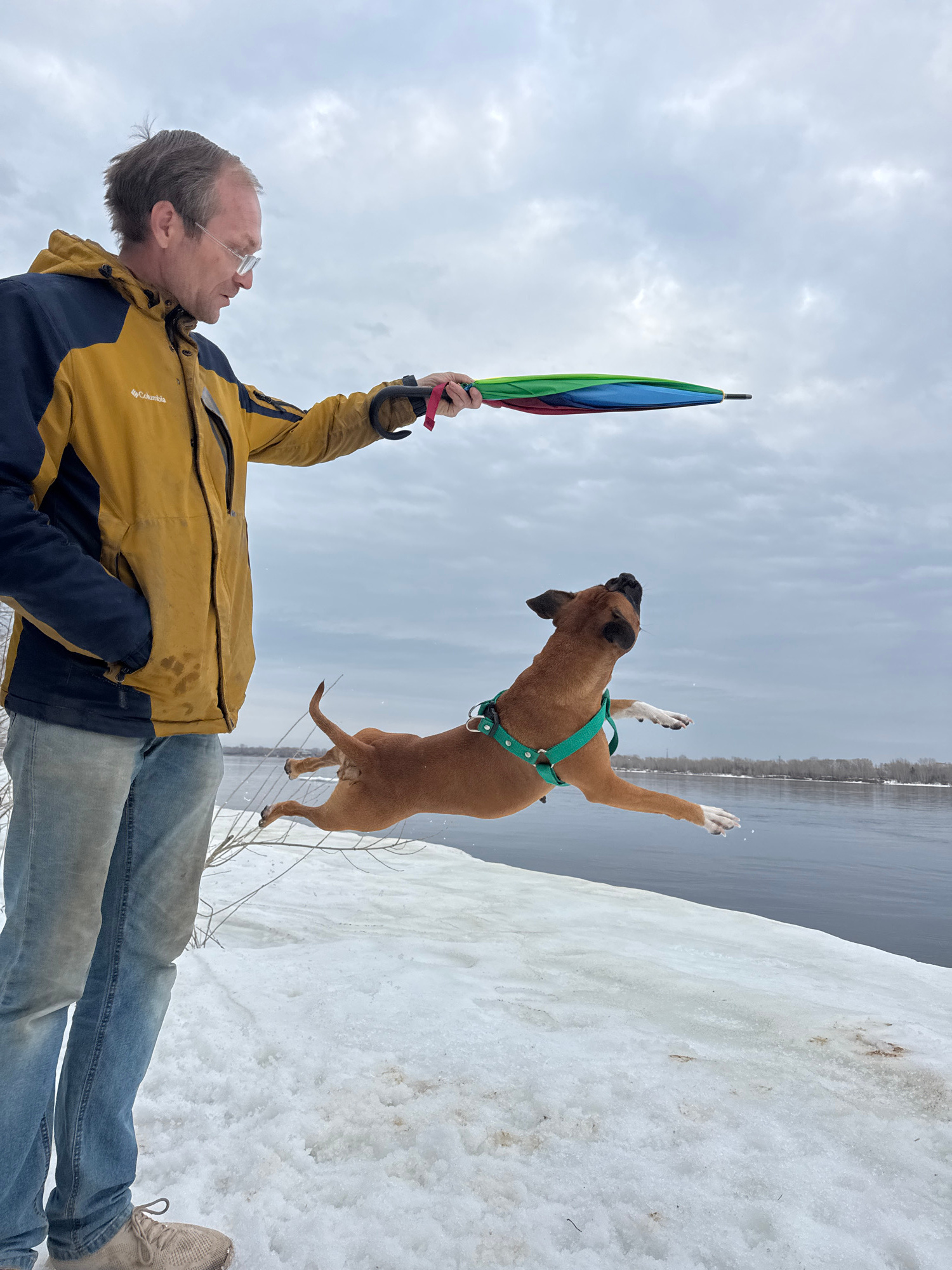 A man wearing a yellow jacket and blue jeans is lying on his back in the snow, holding a closed, multi-colored umbrella. A brown dog with a green harness is jumping in the air near the man, facing theβ¦read more
