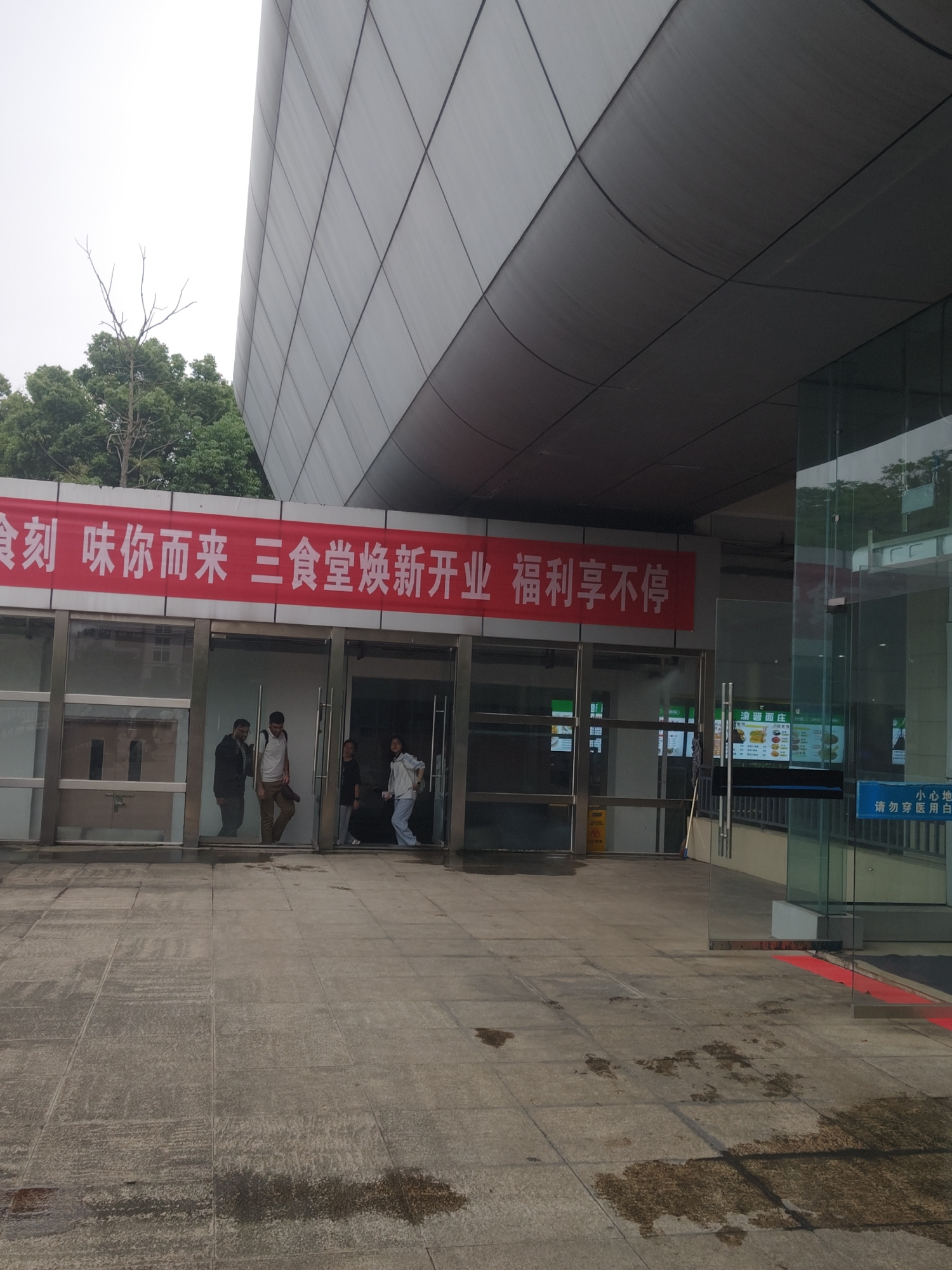 The image shows the entrance to a cafeteria, possibly in Chongqing High-tech Zone, China. A red banner hangs beside the glass doors, featuring Chinese characters vertically aligned, advertising the re…read more