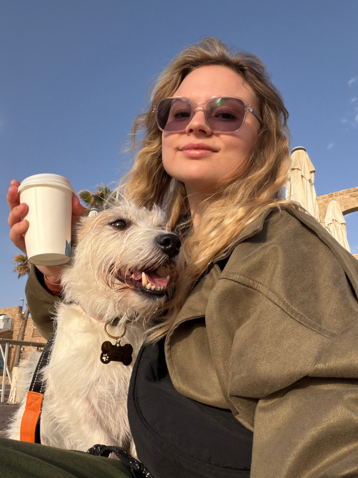 This image depicts a young adult female and a white shaggy-haired terrier-type dog in an outdoor setting at Jaffa Port (Old Jaffa), Tel Aviv, Israel. The female subject occupies the foreground, posit…read more
