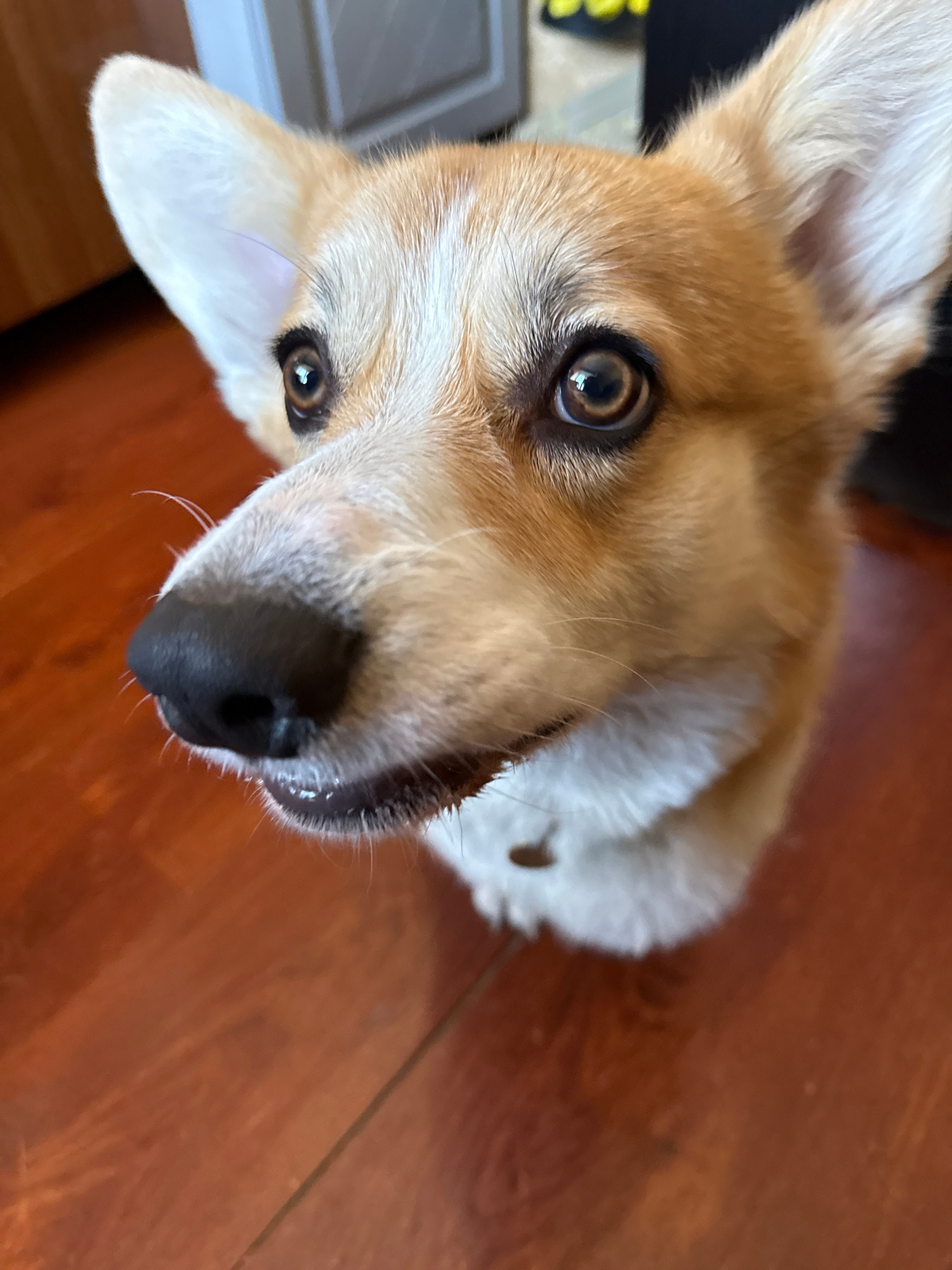 A close-up, tilted view captures a corgi dog on a wooden floor. The dog's head is prominently displayed, showcasing its brown eyes, tan and white fur, and a black nose. The background shows parts of a…read more