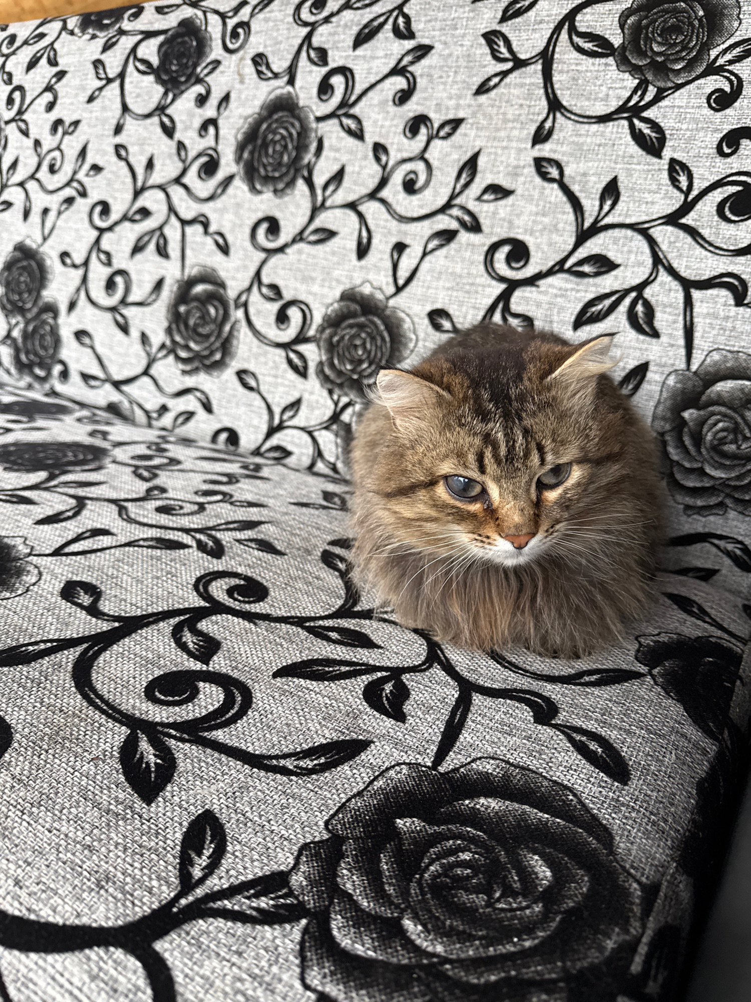 A close-up, high-angle shot shows a fluffy, brown tabby cat resting on a patterned fabric surface. The fabric features a repeating design of black roses and swirling vines on a gray background. The ca…read more