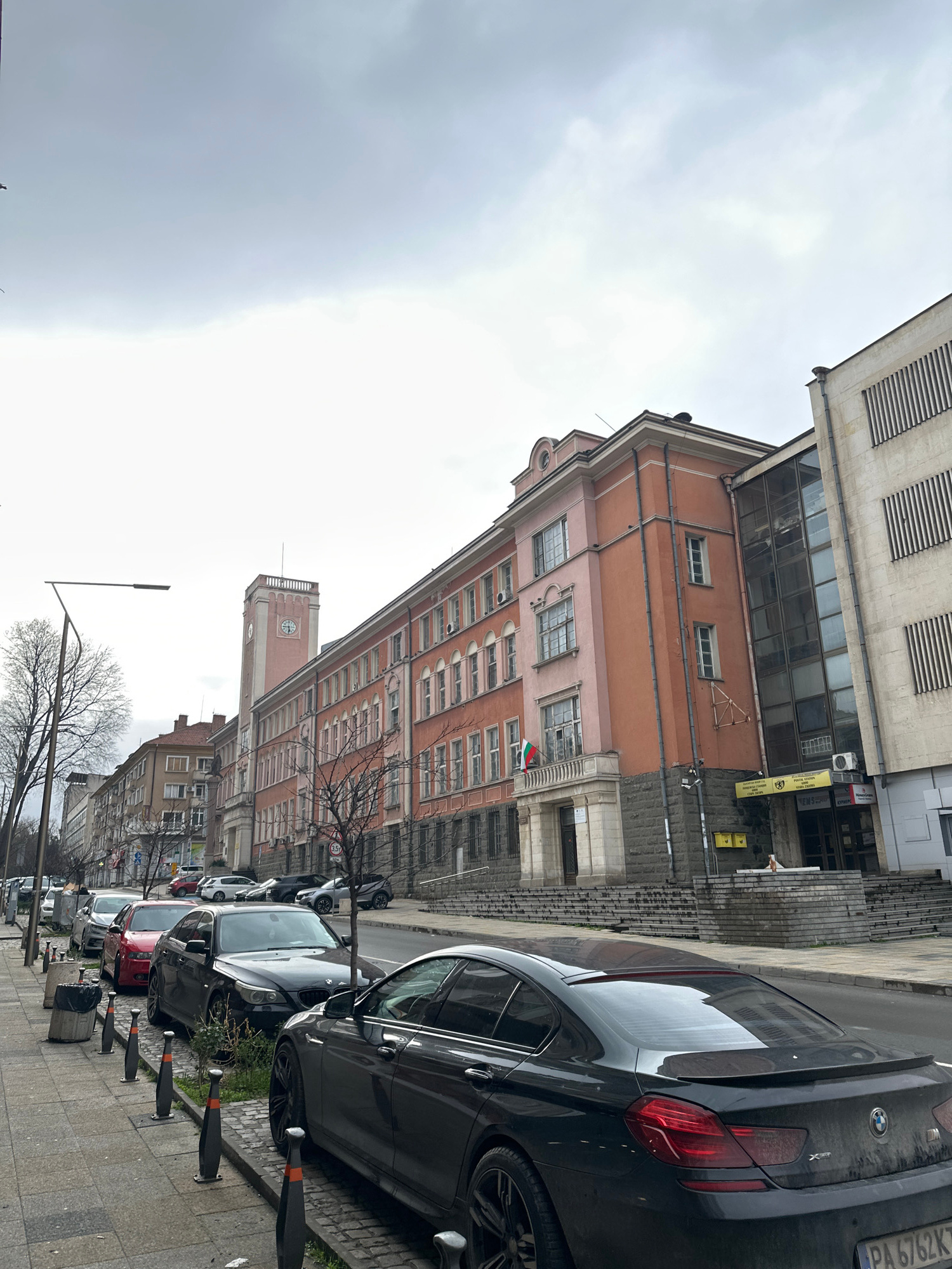 The image shows a street scene in Stara Zagora, Bulgaria, with parked cars and buildings on the right. A black BMW is parked closest to the viewer. Other cars including silver and red vehicles are par…read more