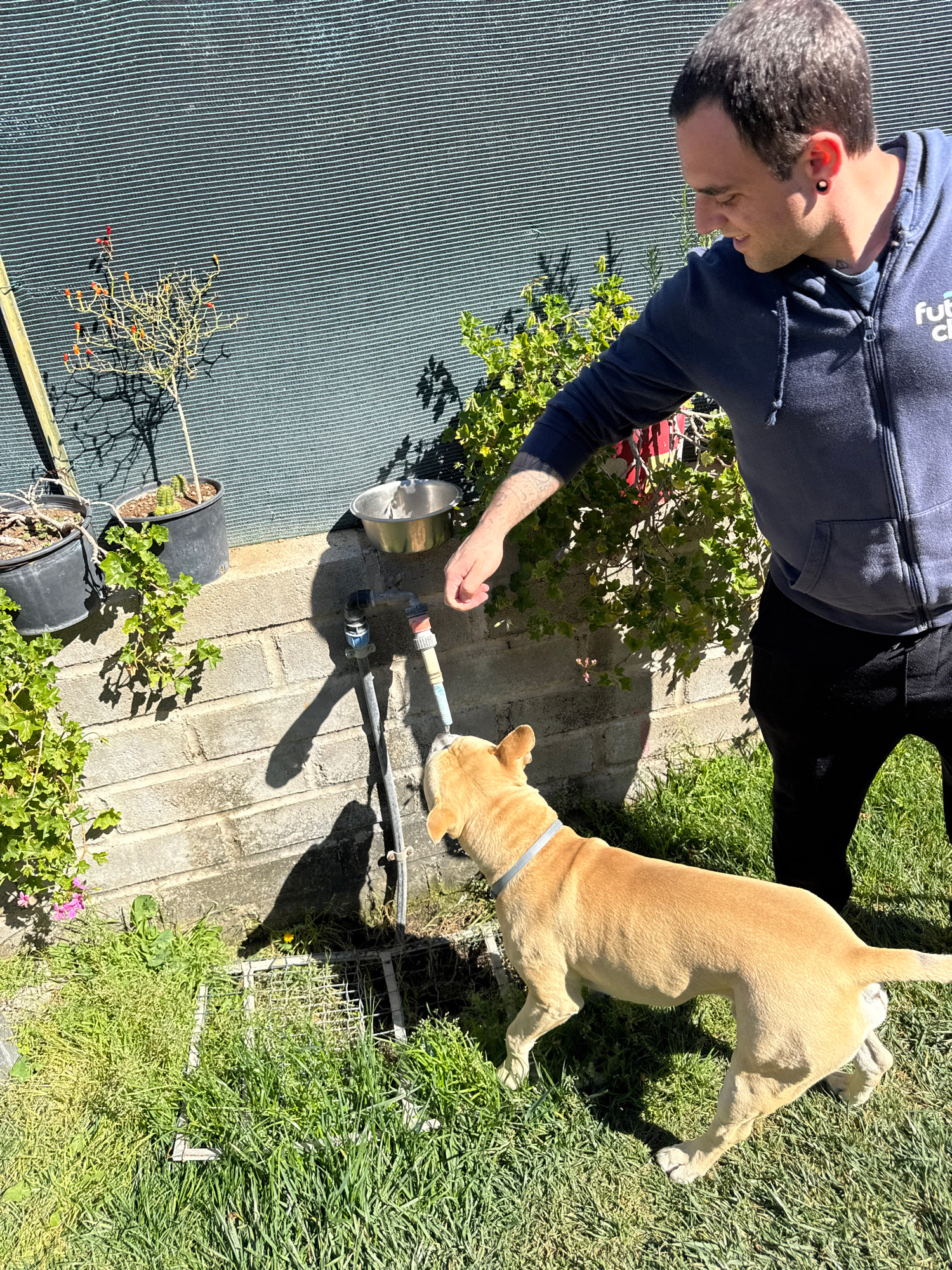 A man wearing a blue hooded sweatshirt and black pants is outside next to a beige, short-haired dog. He is holding a silver metal bowl. The dog is drinking from a pipe coming out of a brick wall. Ther…read more