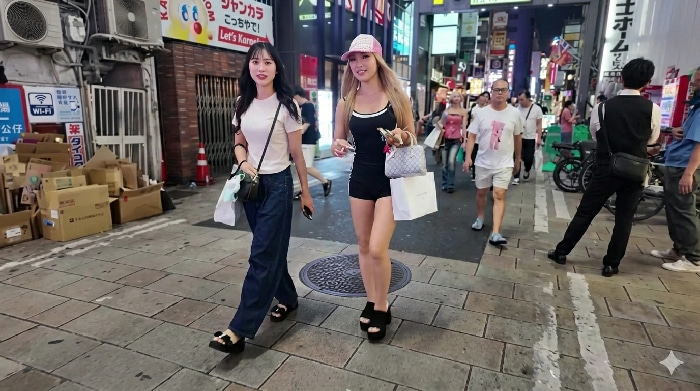 The scene depicts a bustling commercial street in Osaka, Japan, during the evening or night. The paved sidewalk is populated by pedestrians, with buildings lining both sides featuring numerous illumin…read more