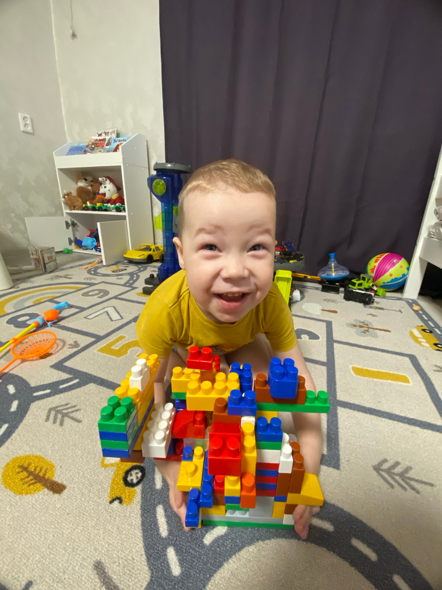 This media file captures a young child playing cheerfully indoors in Sochi, Russia. The child, with light hair and wearing a yellow t-shirt, is positioned on a light-colored rug adorned with a playful…read more
