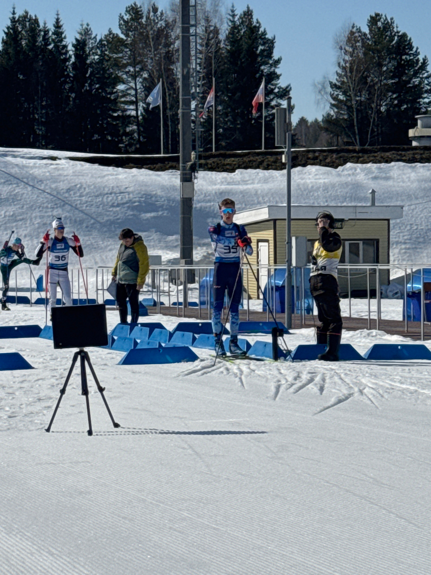 The image displays an outdoor winter sports environment in Прикамский, Russia, under a clear blue sky. The ground is uniformly covered in groomed snow, exhibiting textured patterns from snow-grooming…read more