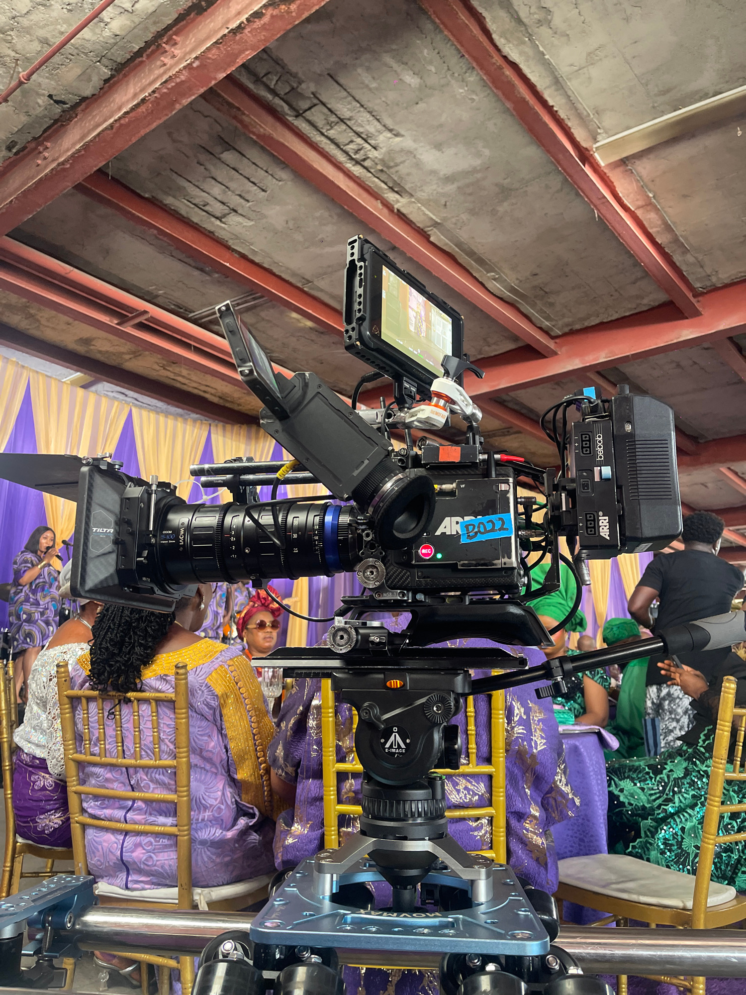 The image shows a professional camera setup in an indoor location, likely a church or event hall. The camera is mounted on a tripod and equipped with accessories like a monitor, lens controls, and an…read more