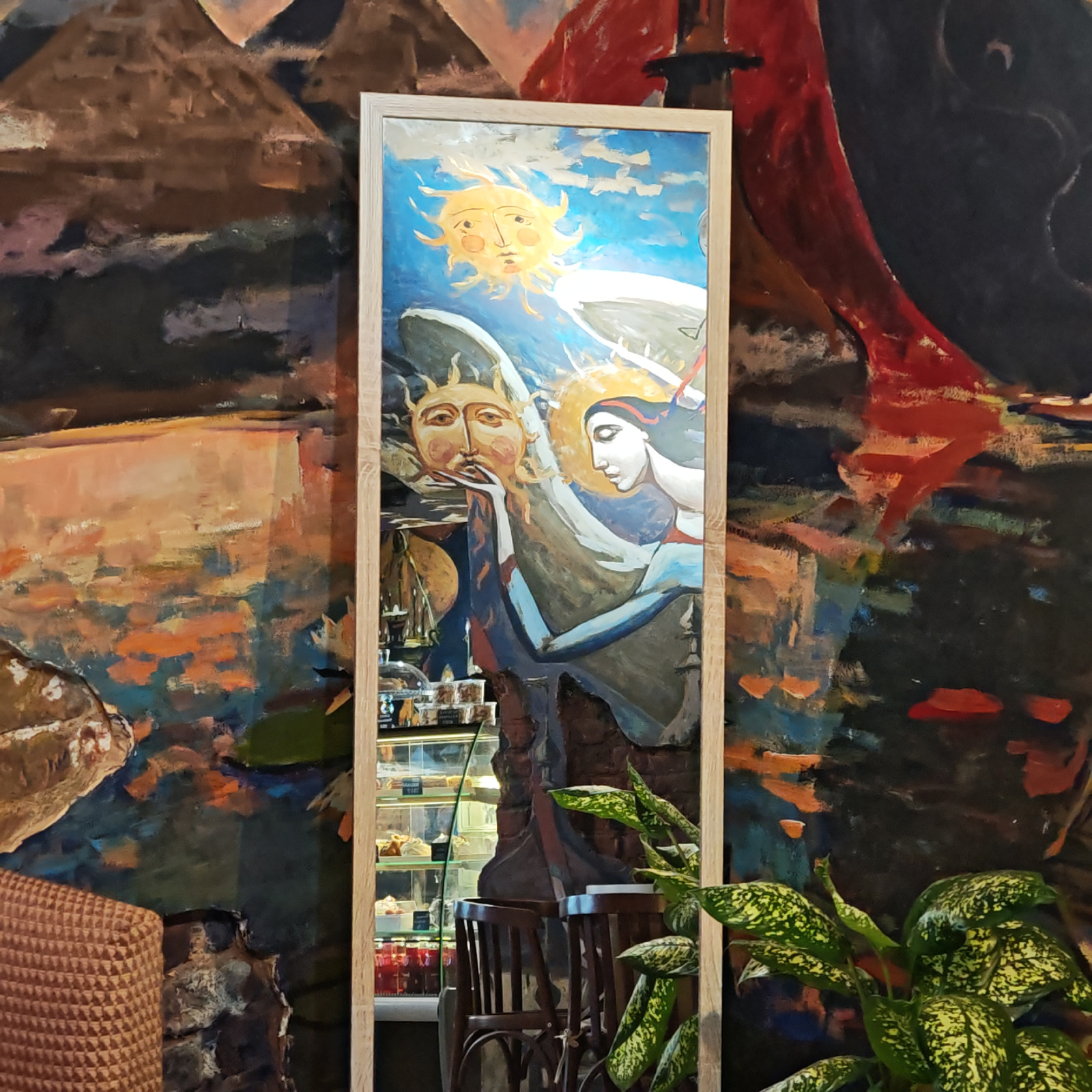 The image is a view of an interior, likely in a public place such as a cafe, in Rostov, Russia. The focal point is a framed artwork of a somewhat folk-art style depicting two sun-like figures, one wit…read more