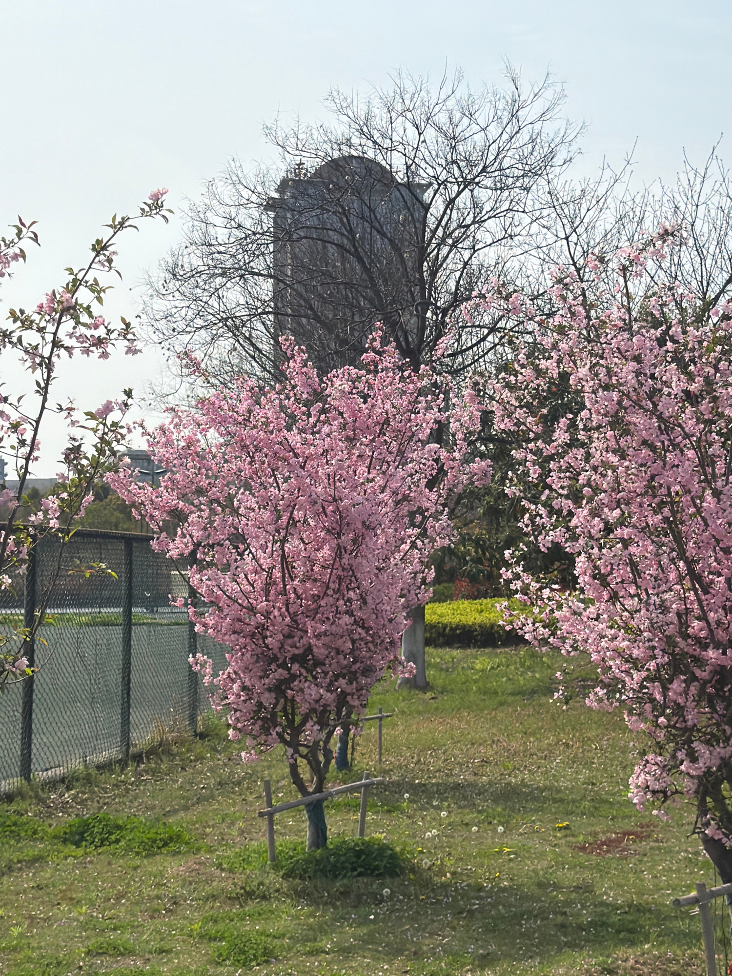The image shows a park setting in what appears to be the Jiangning District, China, based on the architectural style of the cylindrical building partially visible in the background, situated to the le…read more