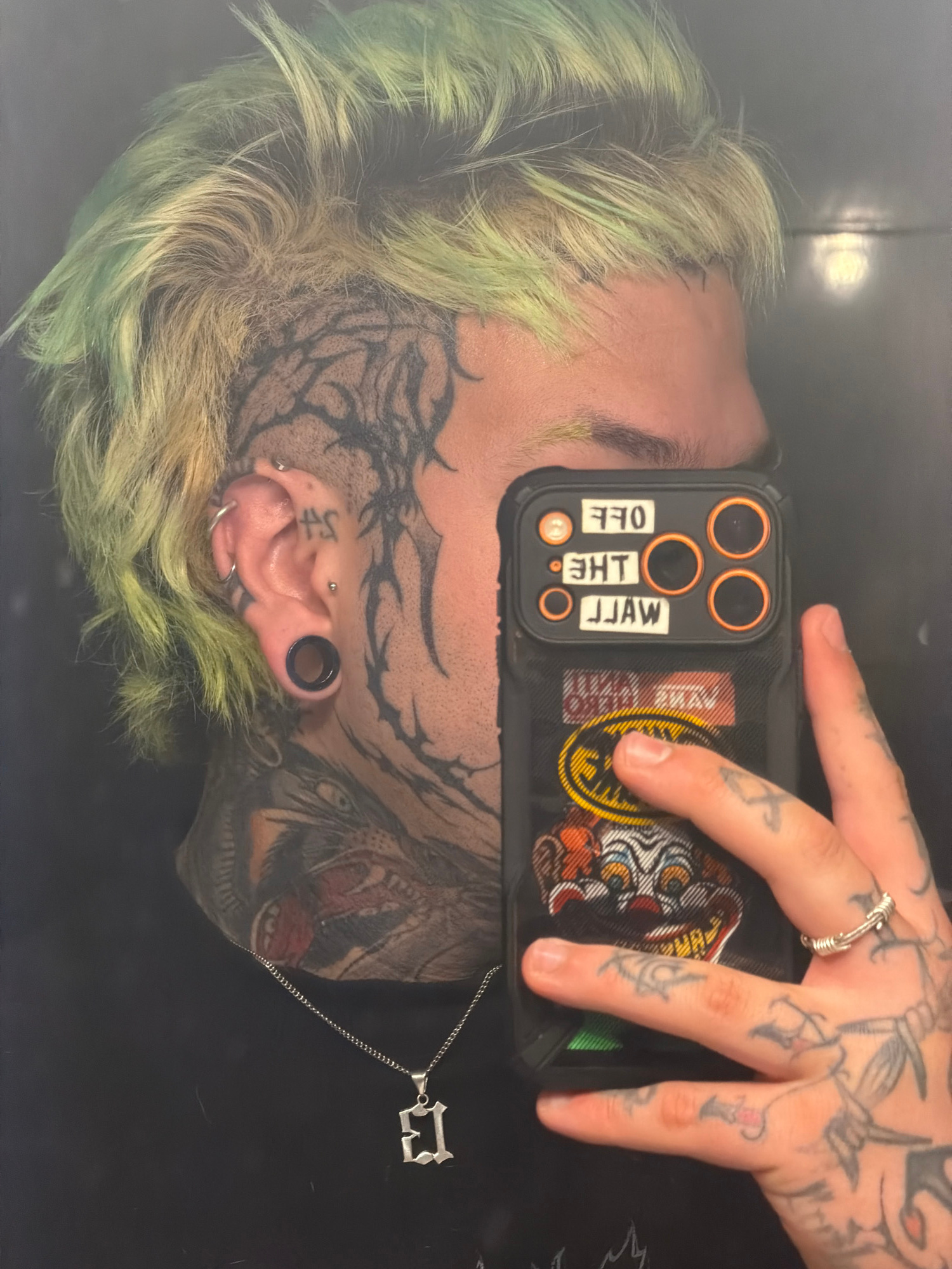 A person is holding a phone in front of their face, taking a selfie or recording a video. The phone case is black with the words "OFF THE WALL" printed on it. The person has green and blonde hair and…read more