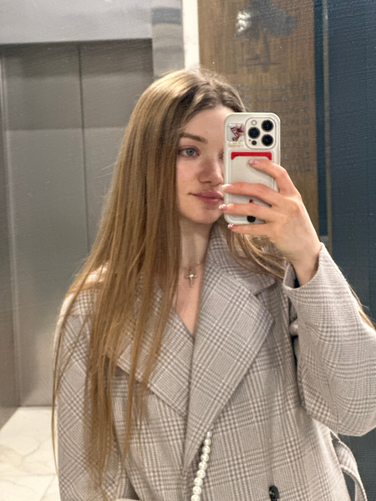 A blonde woman is taking a selfie in a mirror. She is wearing a light grey plaid blazer, a necklace, and holding a smartphone with a white and red case. The mirror appears to be in an elevator or poss…read more
