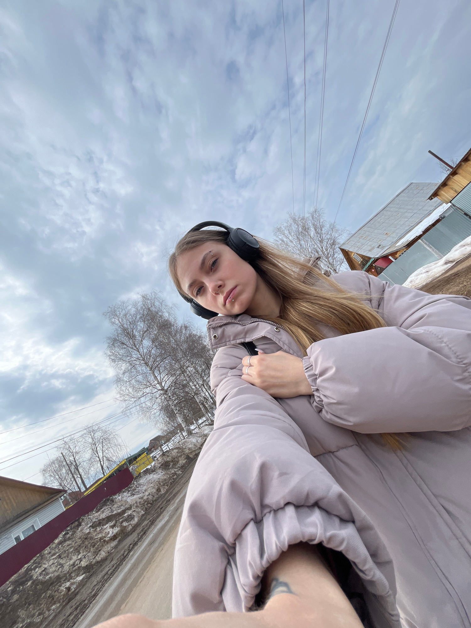A young woman wearing a light purple puffer jacket and black headphones is centered in the frame. She has light brown hair and facial piercings. The image is taken from a low angle, looking up at her…read more