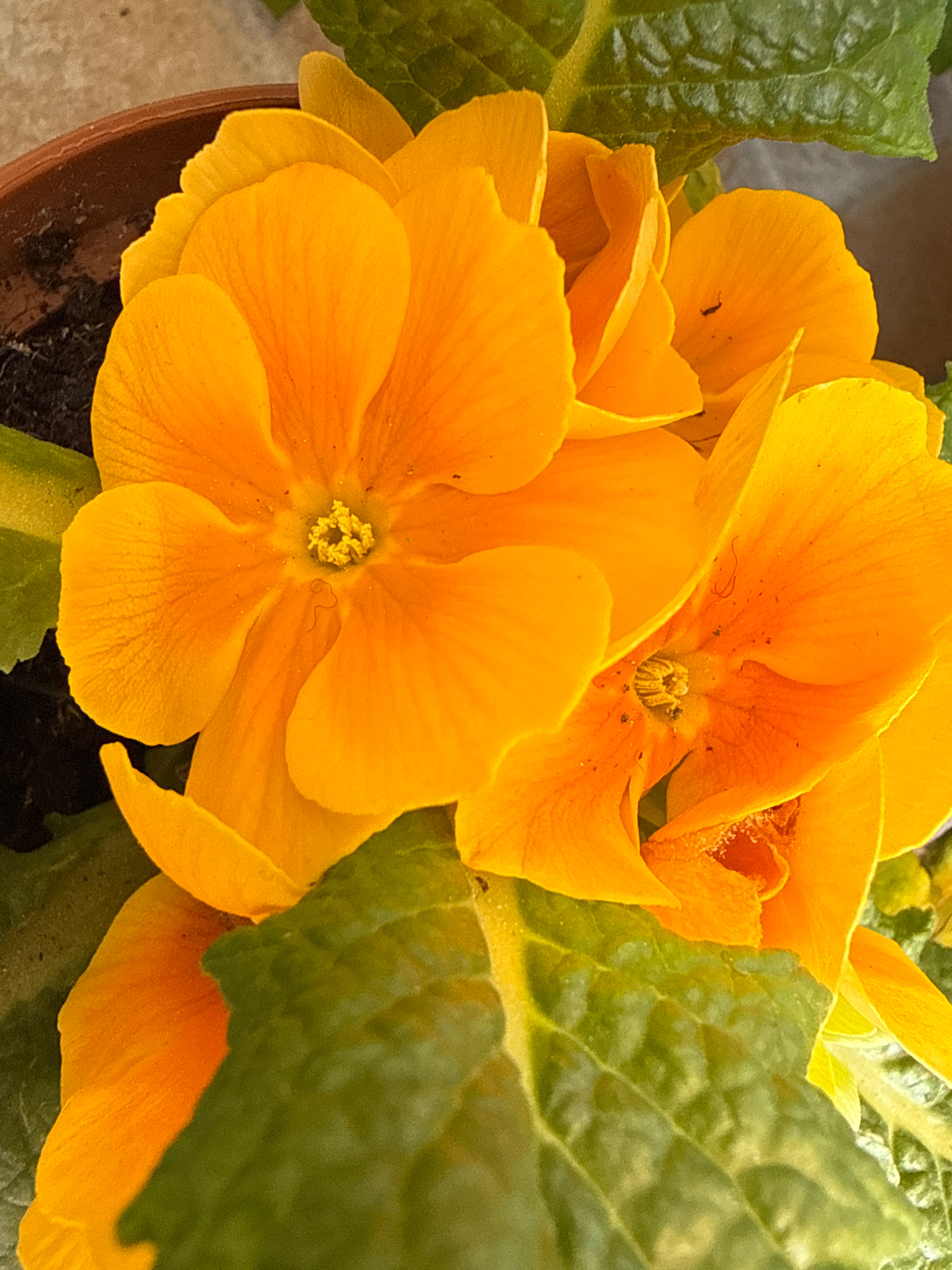 A close-up shot shows a cluster of yellow primrose flowers in a brown pot. The flowers are in full bloom, revealing textured petals and visible stamen. Surrounding the blossoms are leaves with deeply…read more