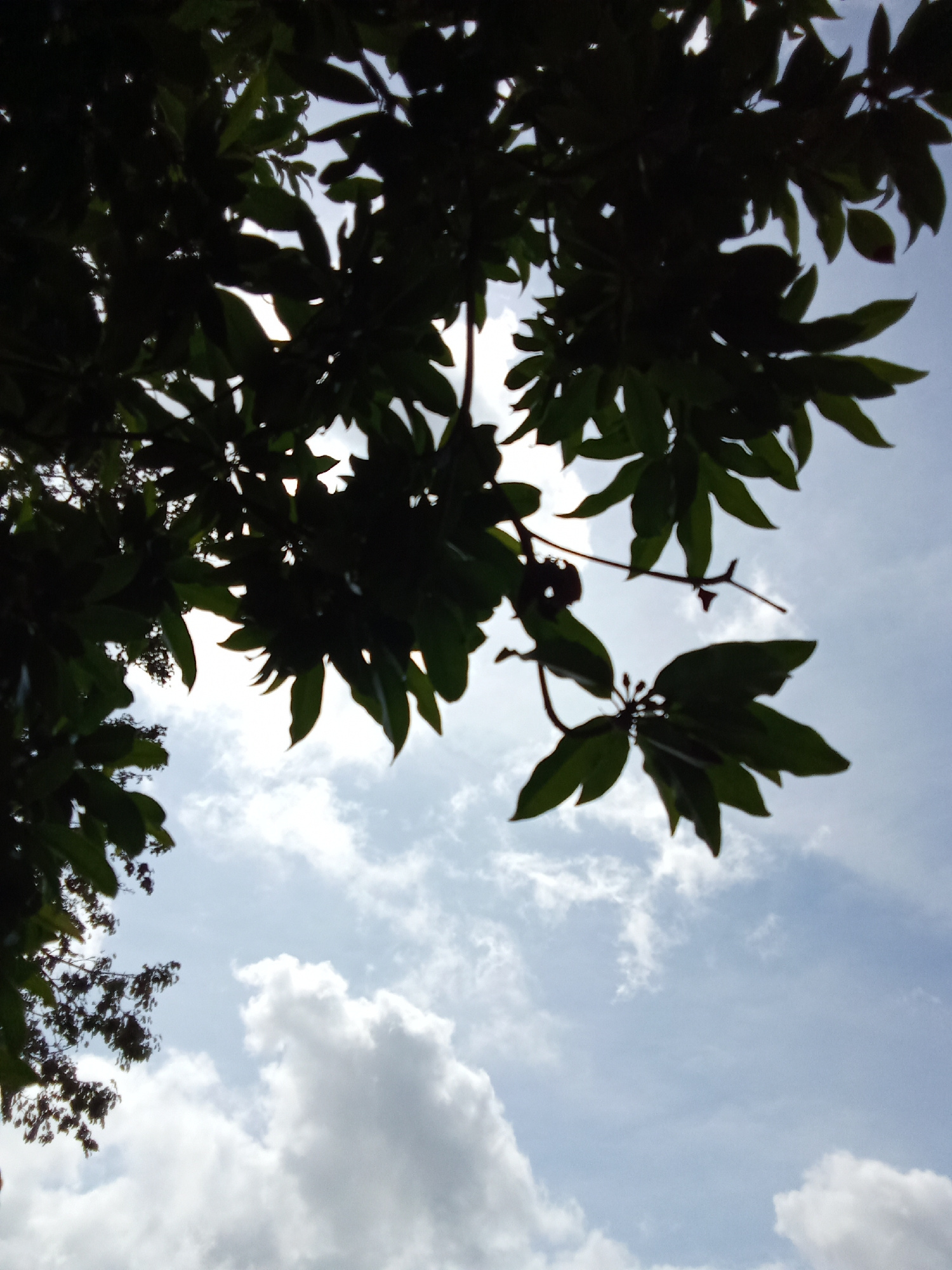 The image, likely taken from Juan Griego, Venezuela given the prompt, shows a view looking upwards through dense foliage toward a cloudy sky. The leaves are heavily silhouetted, suggesting a strong li…read more