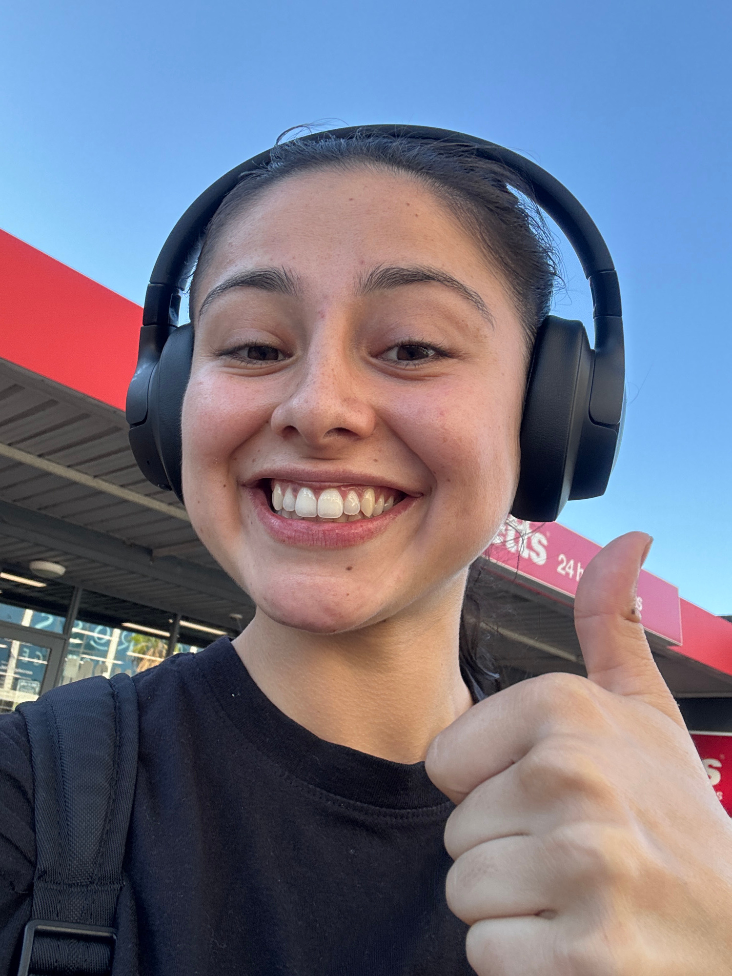 A young woman is taking a selfie outdoors. She is smiling broadly and giving a thumbs-up. She is wearing black over-ear headphones and a black t-shirt with a strap across her shoulder, possibly from a…read more