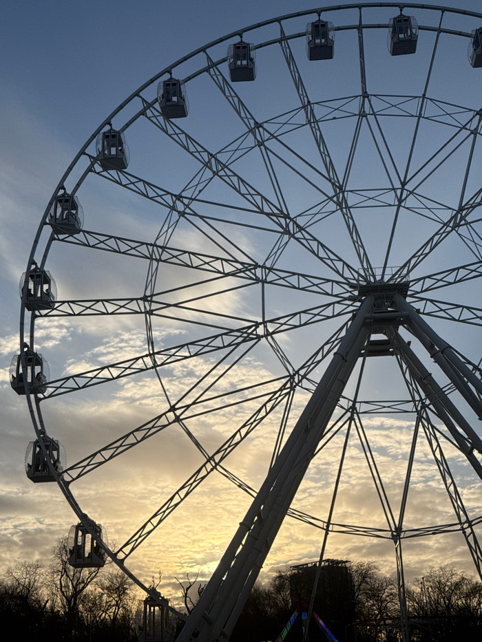 The image displays a large Ferris wheel in Anapa, Russia, silhouetted against a sky transitioning from light blue at the top left to a warm golden-yellow at the lower right horizon, indicative of eith…read more