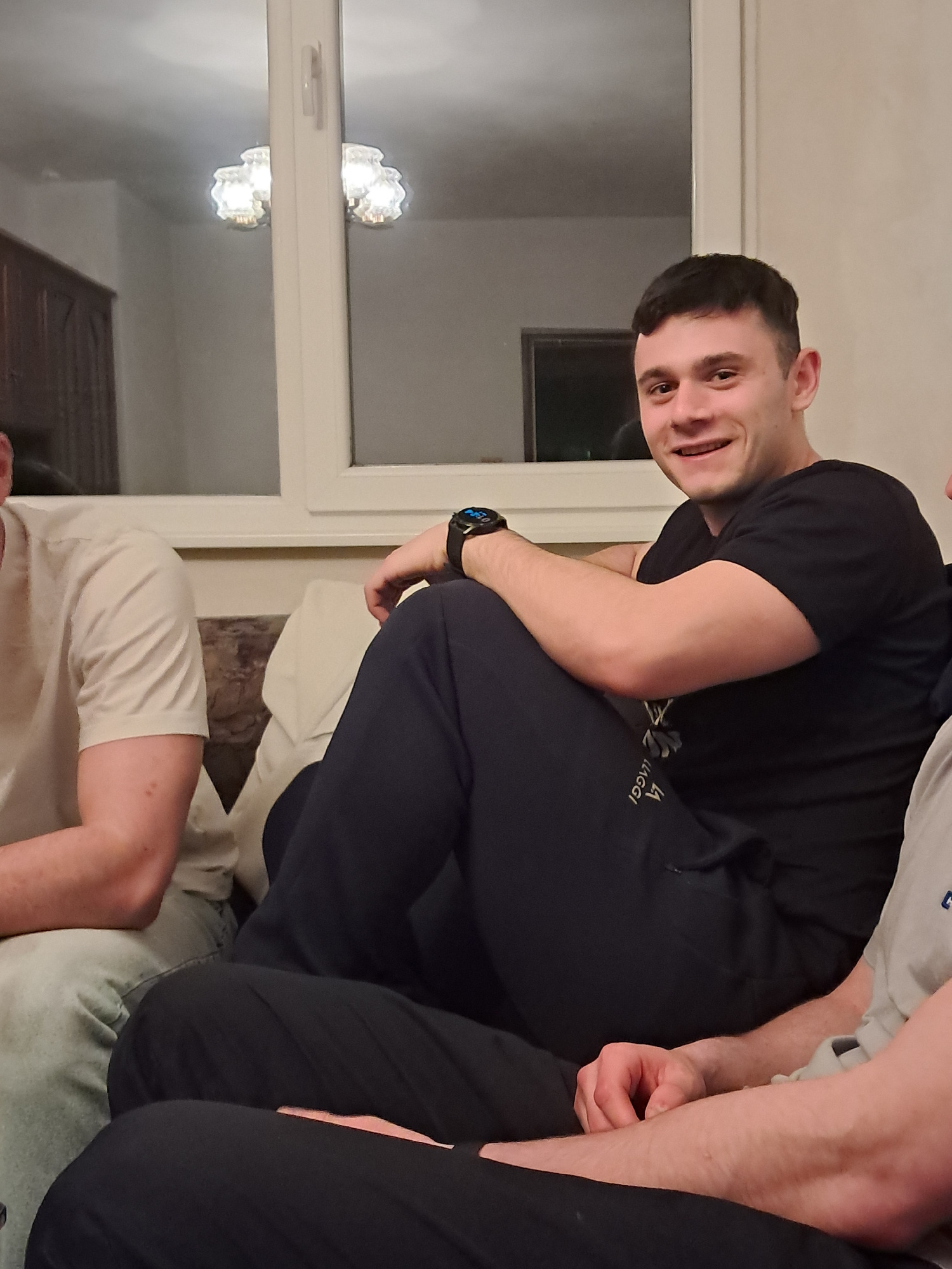 A man in a black t-shirt and black sweatpants with the word "LA MAGGI" on the leg is sitting on a couch with other people. The man is smiling and looking at the camera. He is wearing a smartwatch on h…read more