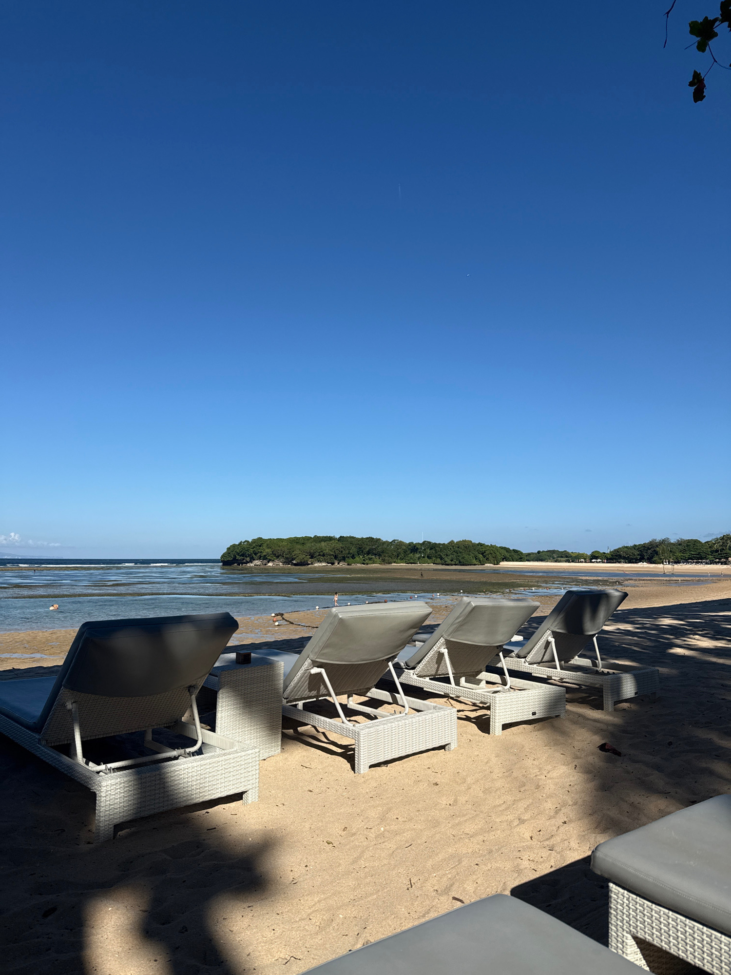 The image depicts a beach scene, likely in Kuta Selatan, Indonesia. The composition features a row of lounge chairs arranged on the sandy shoreline. The chairs are constructed from a woven material an…read more