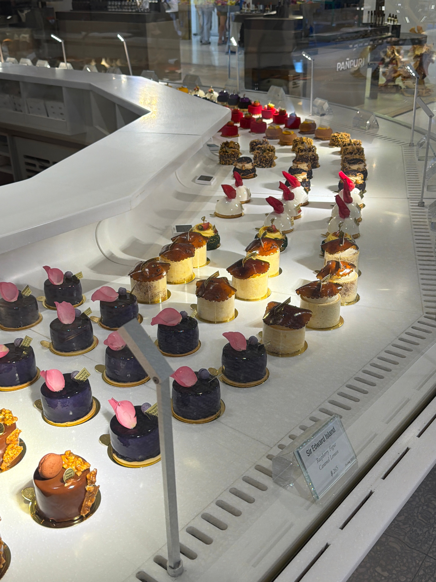 This is a photograph of a pastry display case, likely taken in a bakery or dessert shop. The brand “PANPURI” is visible, which is a luxury lifestyle brand based in Bangkok, Thailand. The display case…read more