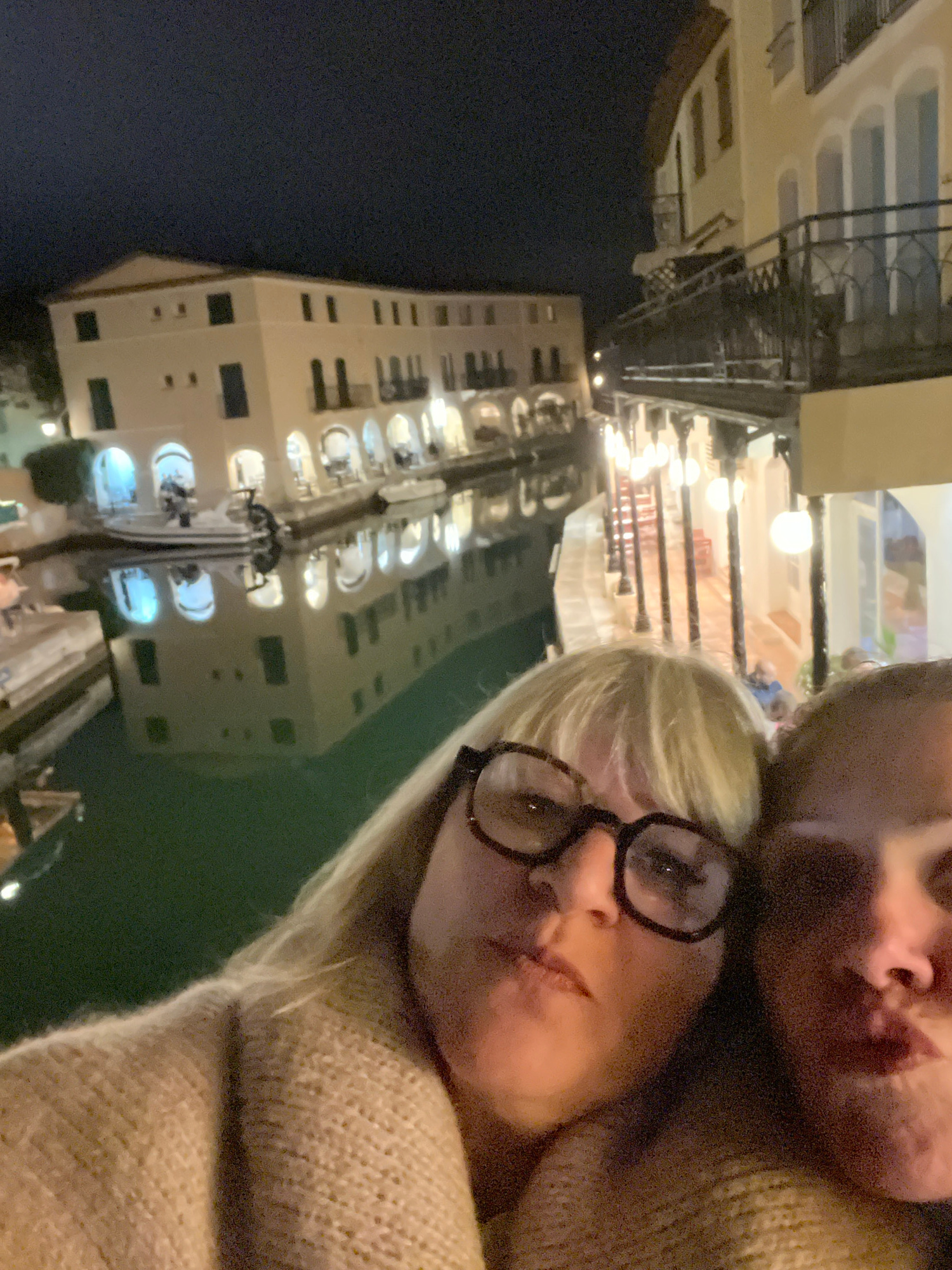 Two individuals are in the foreground, with the lower individual wearing glasses and blond hair. Behind them, a tall, light-colored building is visible, illuminated with internal lighting. The buildin…read more