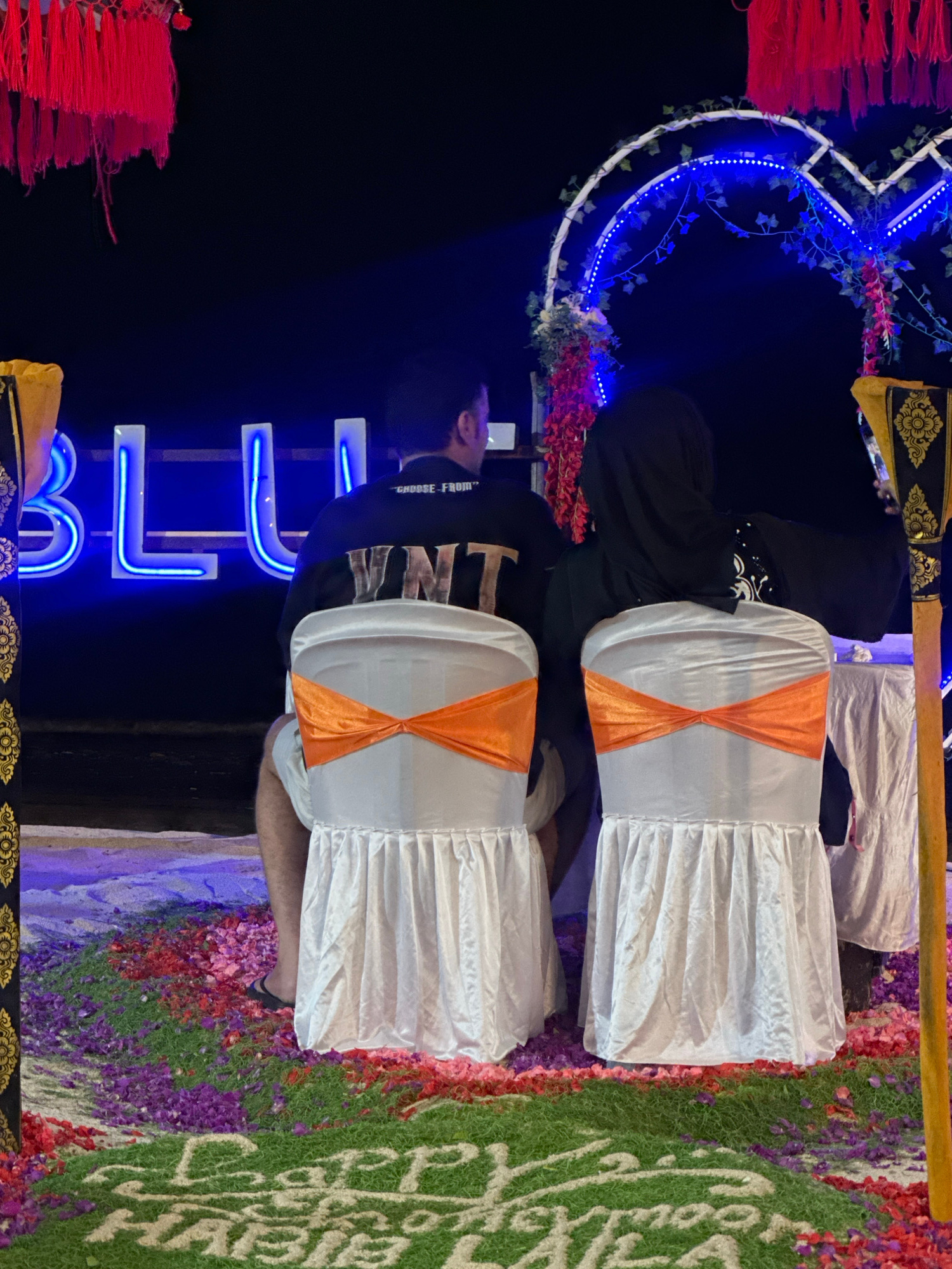 Two adults are sitting in chairs covered with white fabric and orange sashes, illuminated by blue neon lights, positioned near an ornate floral arrangement and grass rug. The location appears to be in…read more