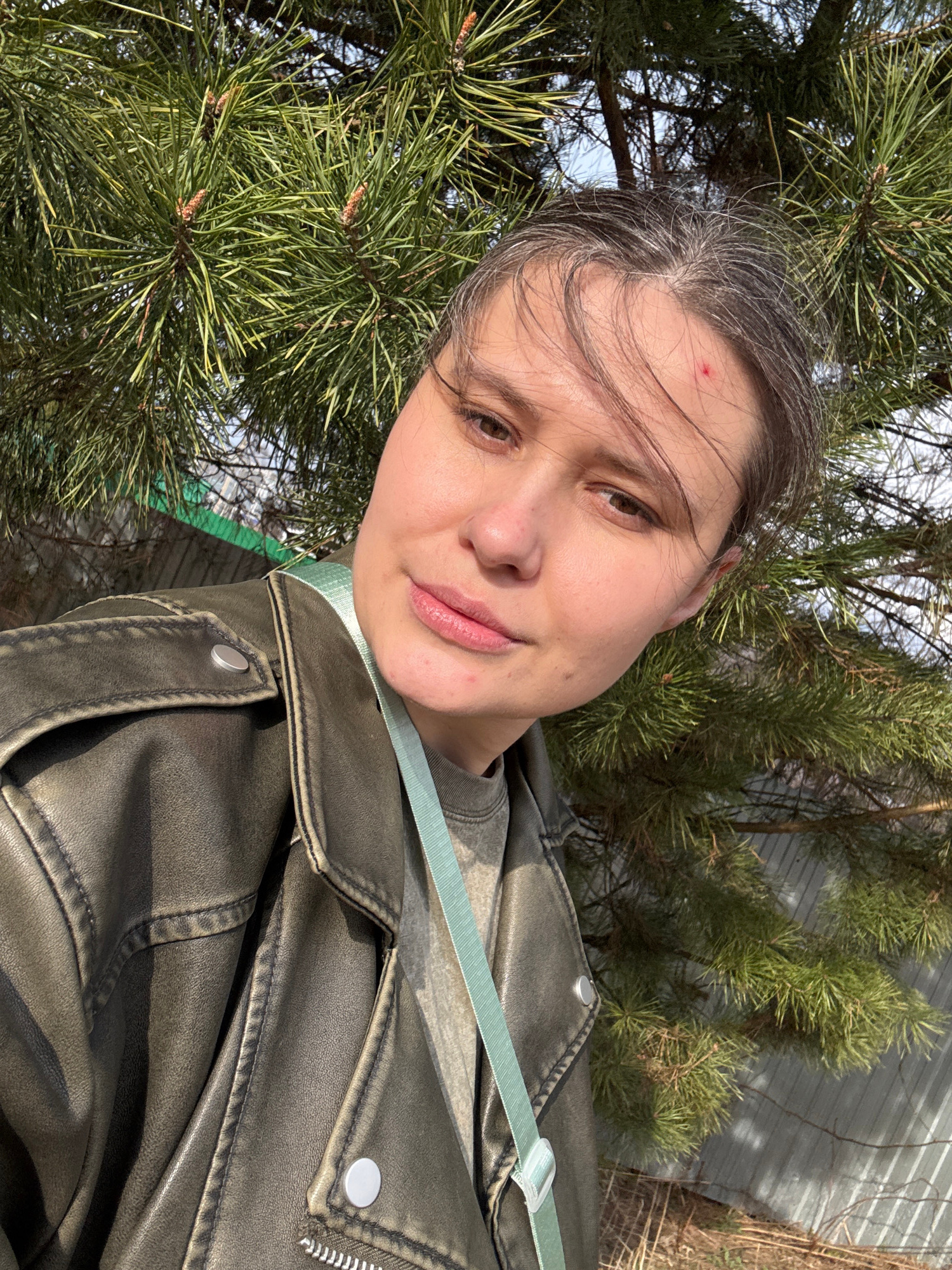 A woman is featured in a close-up, tilted outdoor portrait, likely a selfie. She appears to be in her 30s or 40s, with short, dark hair that has visible grey strands. She has brown eyes and a fair com…read more