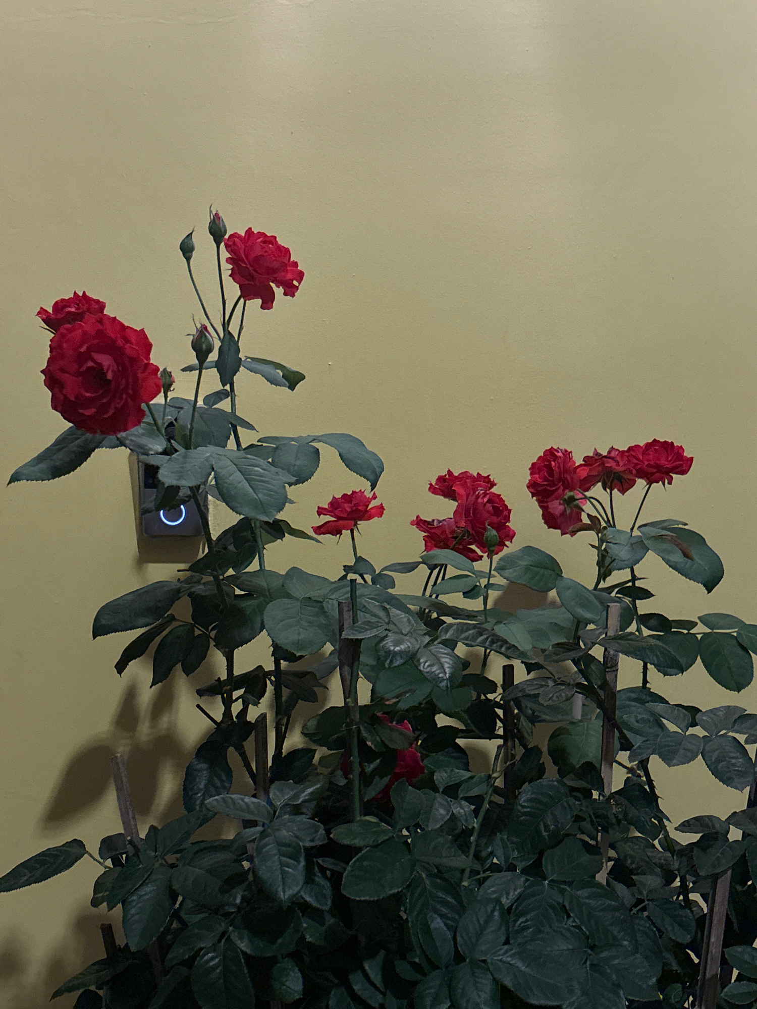 A climbing rose bush with dark green leaves and bright red roses is affixed to a pale yellow wall indoors. The roses and some of the leaves are partially obscuring a square device on the wall with a g…read more