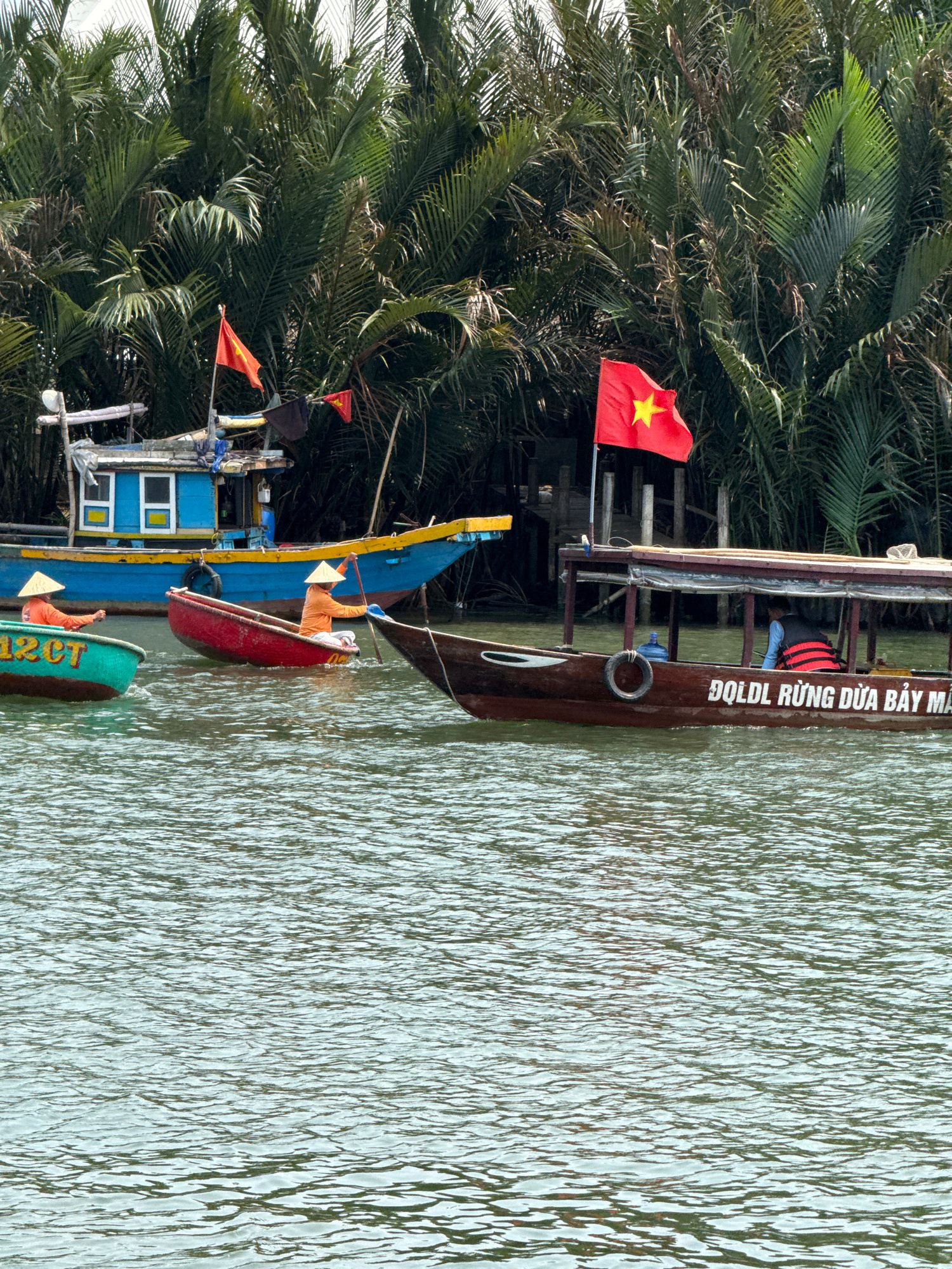 The image captures a vibrant scene on a waterway, likely a river or canal, in a tropical setting. It is daytime, with bright light reflecting off the water. The main subjects are several boats and a…read more