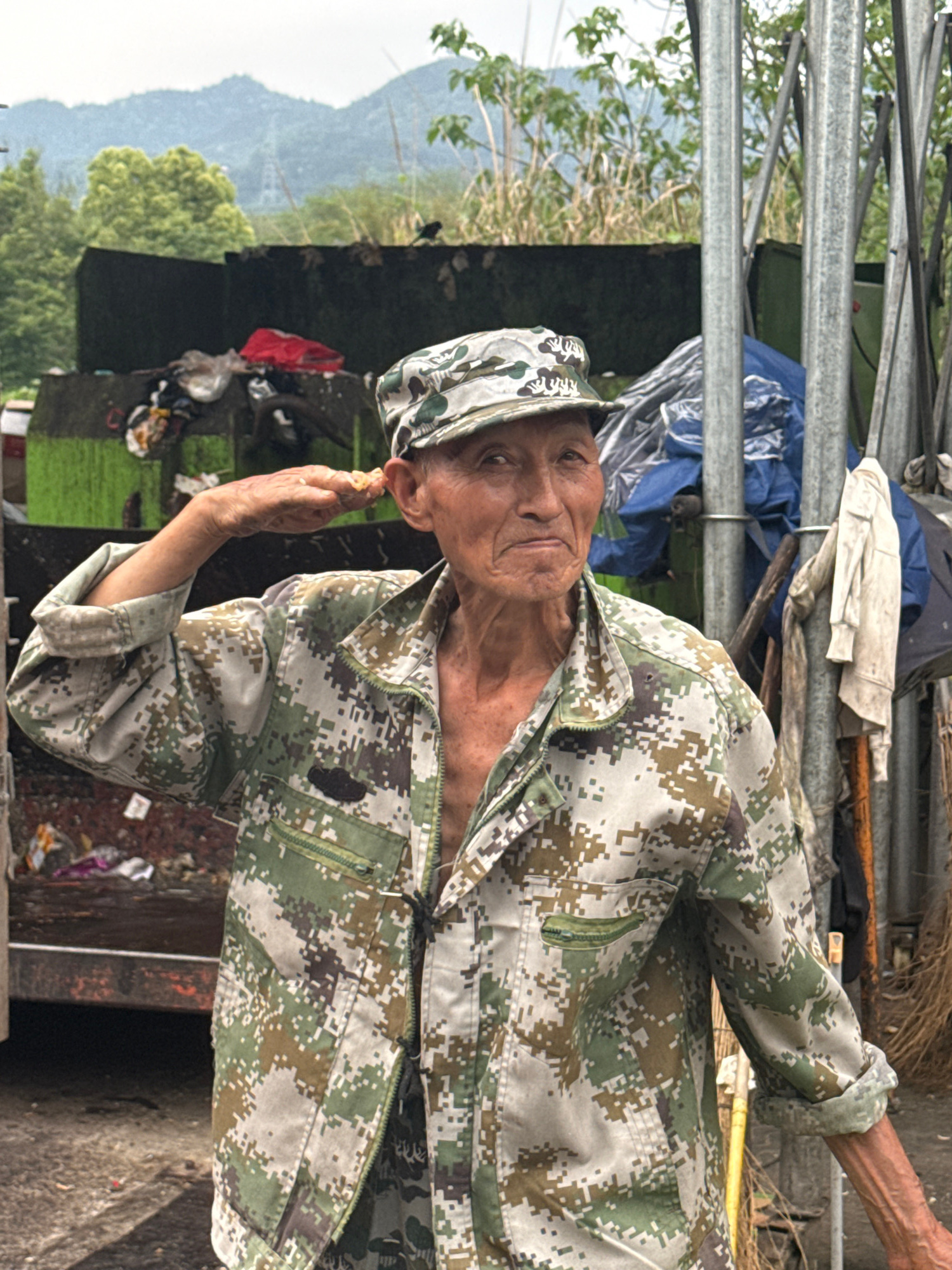 A medium shot captures an elderly person, presumably male, with a weathered face and aged features. He is wearing a camouflage patterned shirt and cap. He is holding a small piece of food towards his…read more