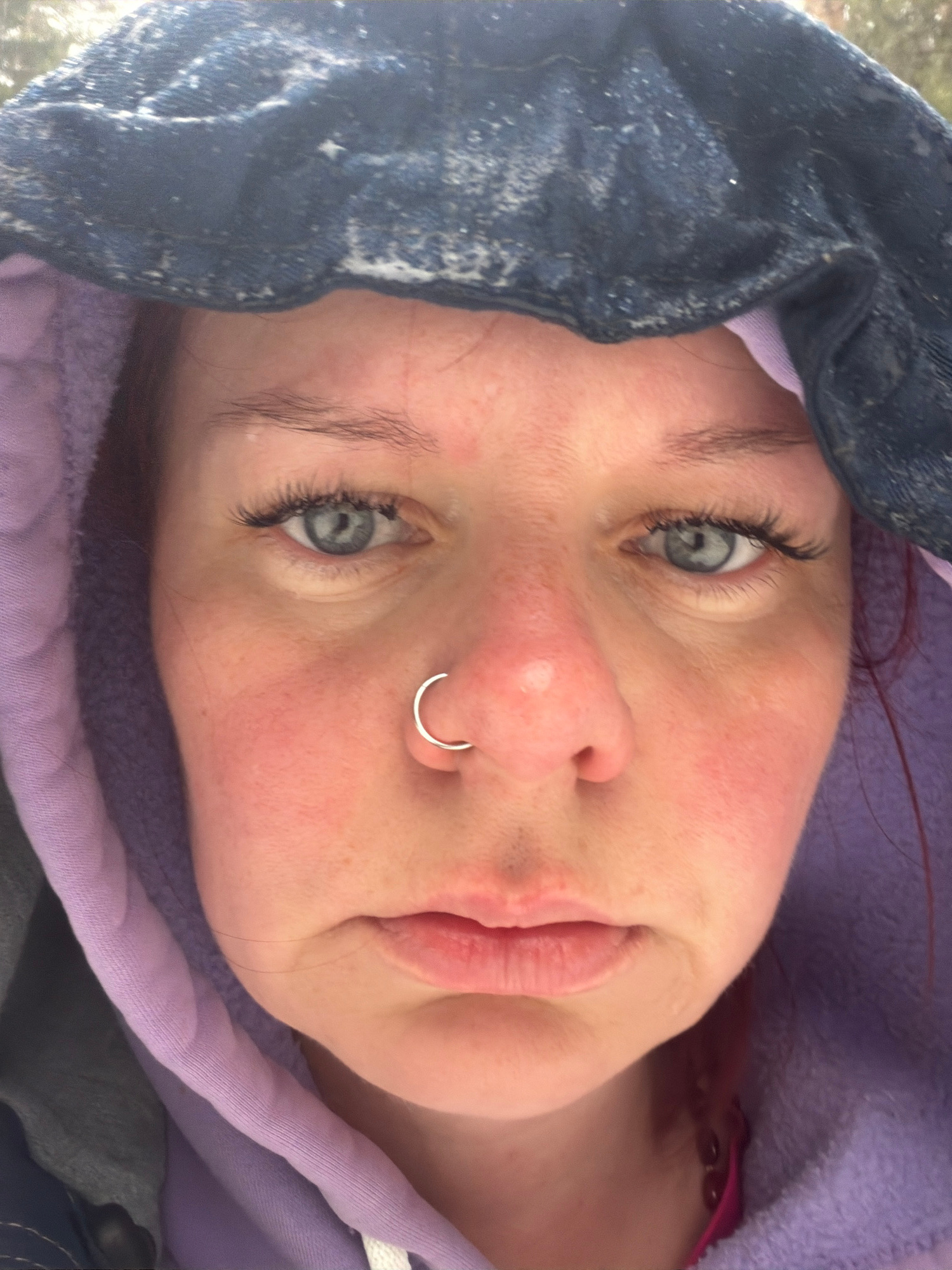 A close-up, tilted portrait depicts a fair-skinned individual with a silver nose ring. The person has gray eyes, visible eyelashes, and reddish hair strands. The person is wearing a lilac-colored hood…read more