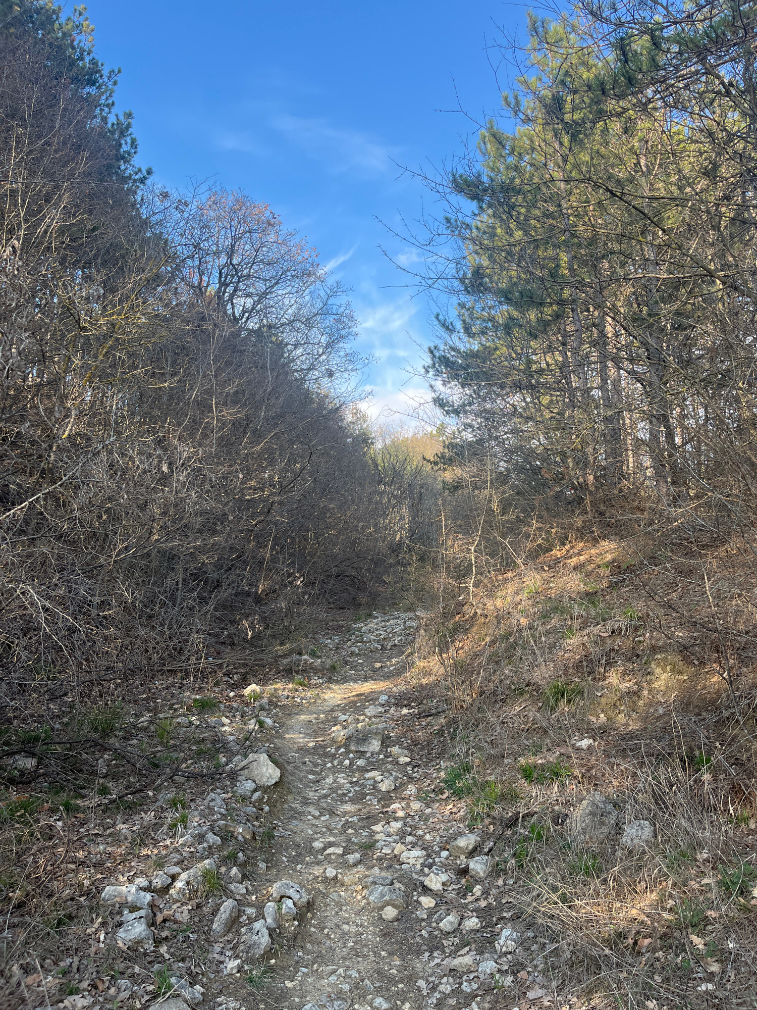 The image presents a landscape view from what appears to be a rocky, uneven path in a wooded area. The scene is dominated by dry vegetation, shrubs with bare branches, and rocky terrain. In the backgr…read more