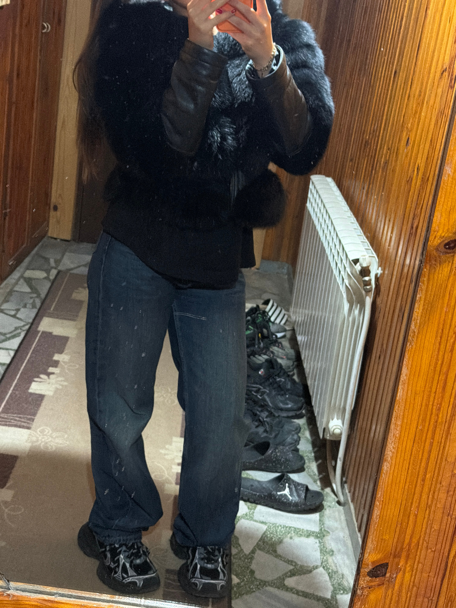 A person wearing a black fur-trimmed jacket, dark jeans, and black boots stands inside a room with wooden walls and ceiling. The person is holding a red object, possibly a phone. Above the person, theβ¦read more