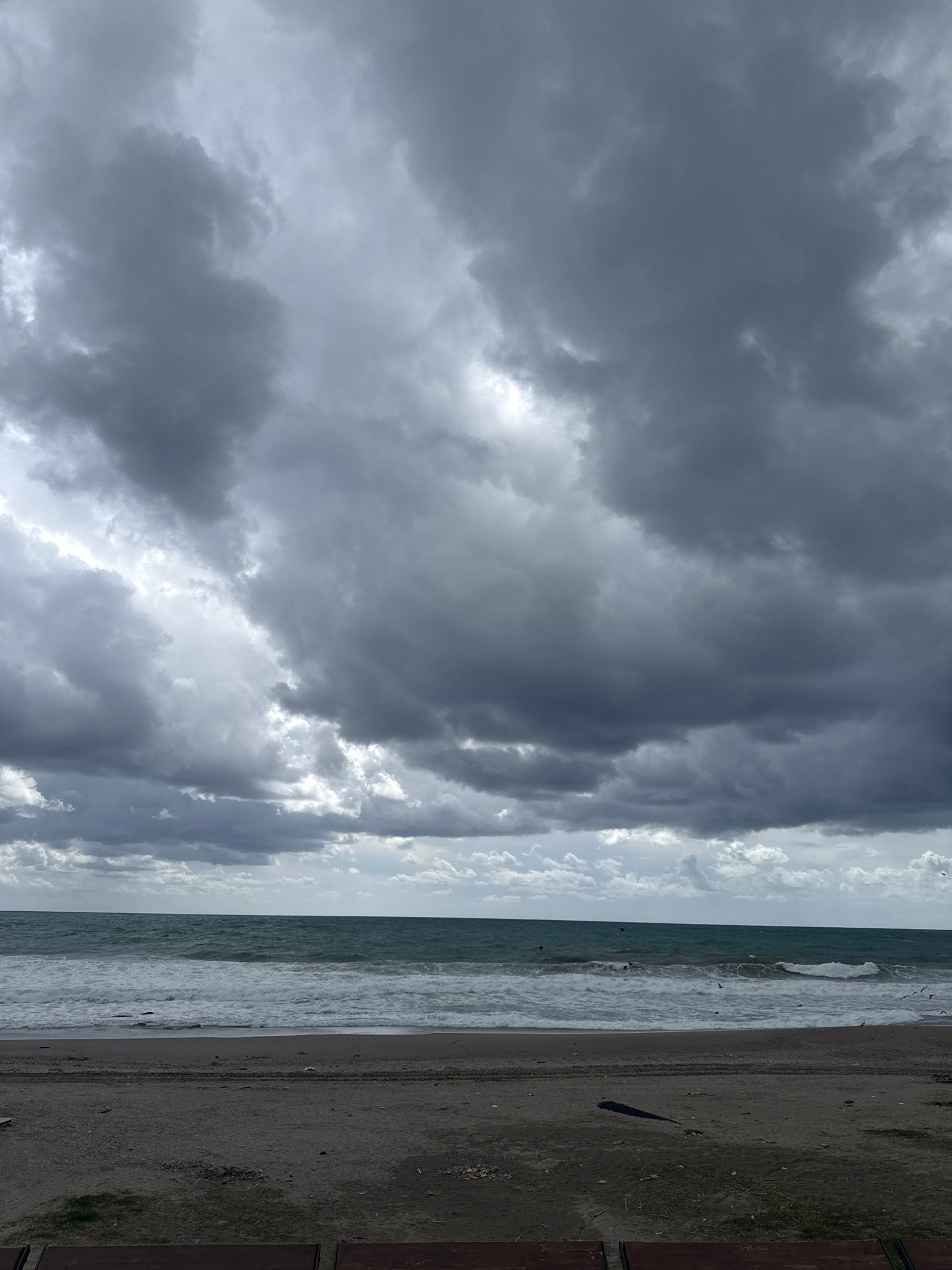 The image shows a beach scene in Alanya, Turkey, under a heavily clouded sky. The sea is visible, with waves breaking near the shoreline. The beach itself is sandy and appears to be slightly wet. To t…read more