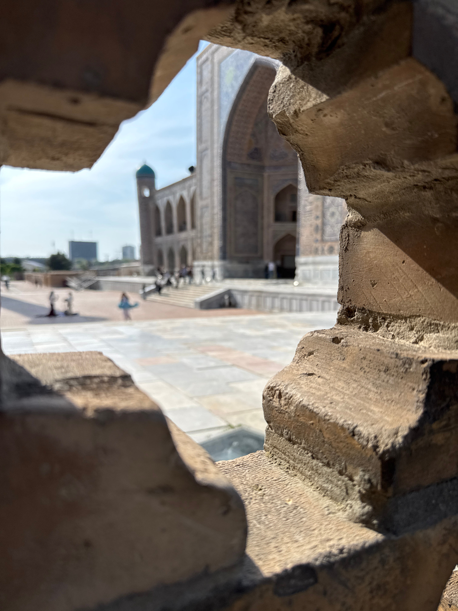 The image captures an exterior view of what appears to be the courtyard and buildings of a religious or historical site, observed through a framed stone structure. The setting is likely Samarkand Cityβ¦read more