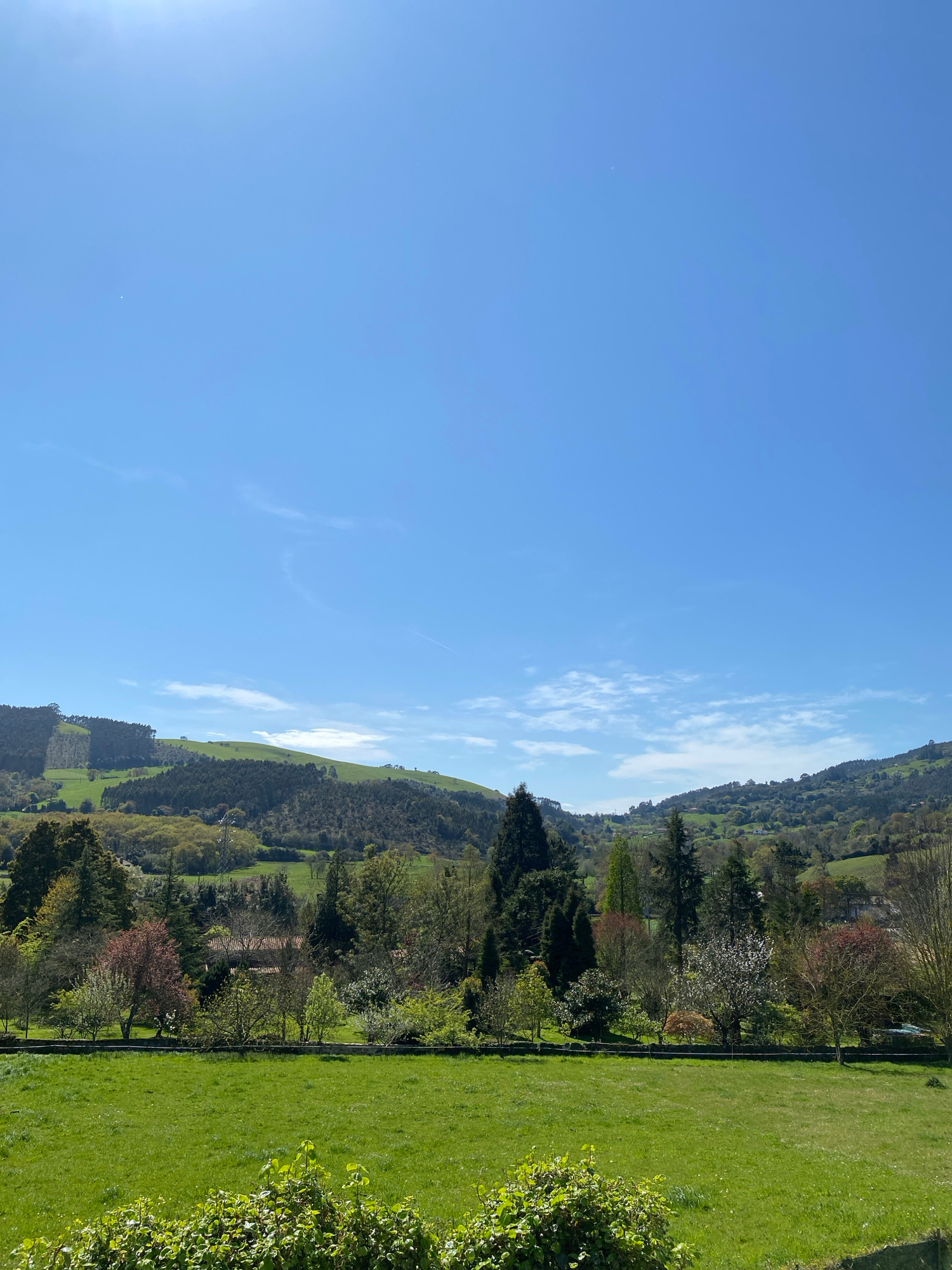 The image shows a landscape with green hills, trees, and a clear blue sky. The scene is located in Villaviciosa, Spain, as evidenced by the architectural style and vegetation common to the region. The…read more