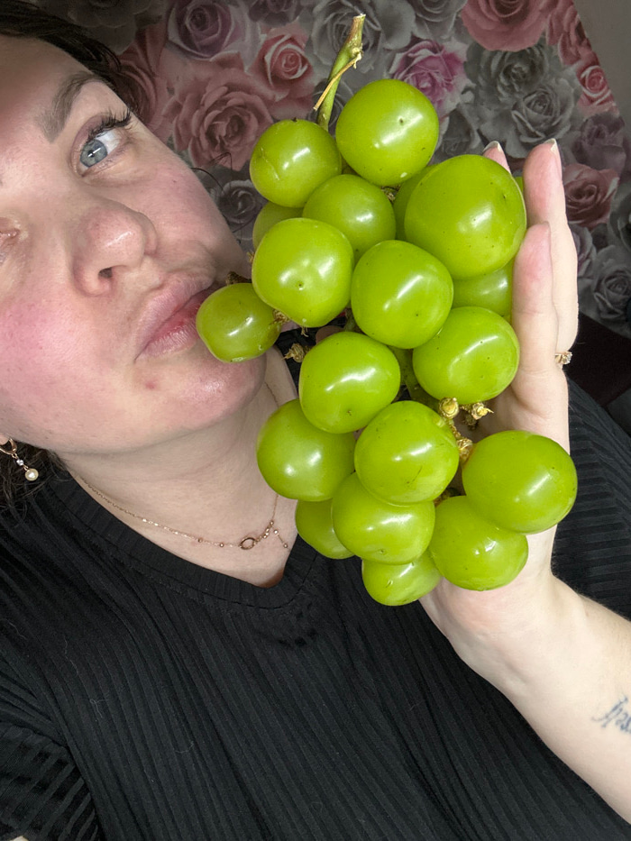 An adult female is partially depicted in an indoor setting. Her face, showing blue eyes and full lips, is angled from the upper left, with her left cheek pressed against one of the green grapes. She w…read more