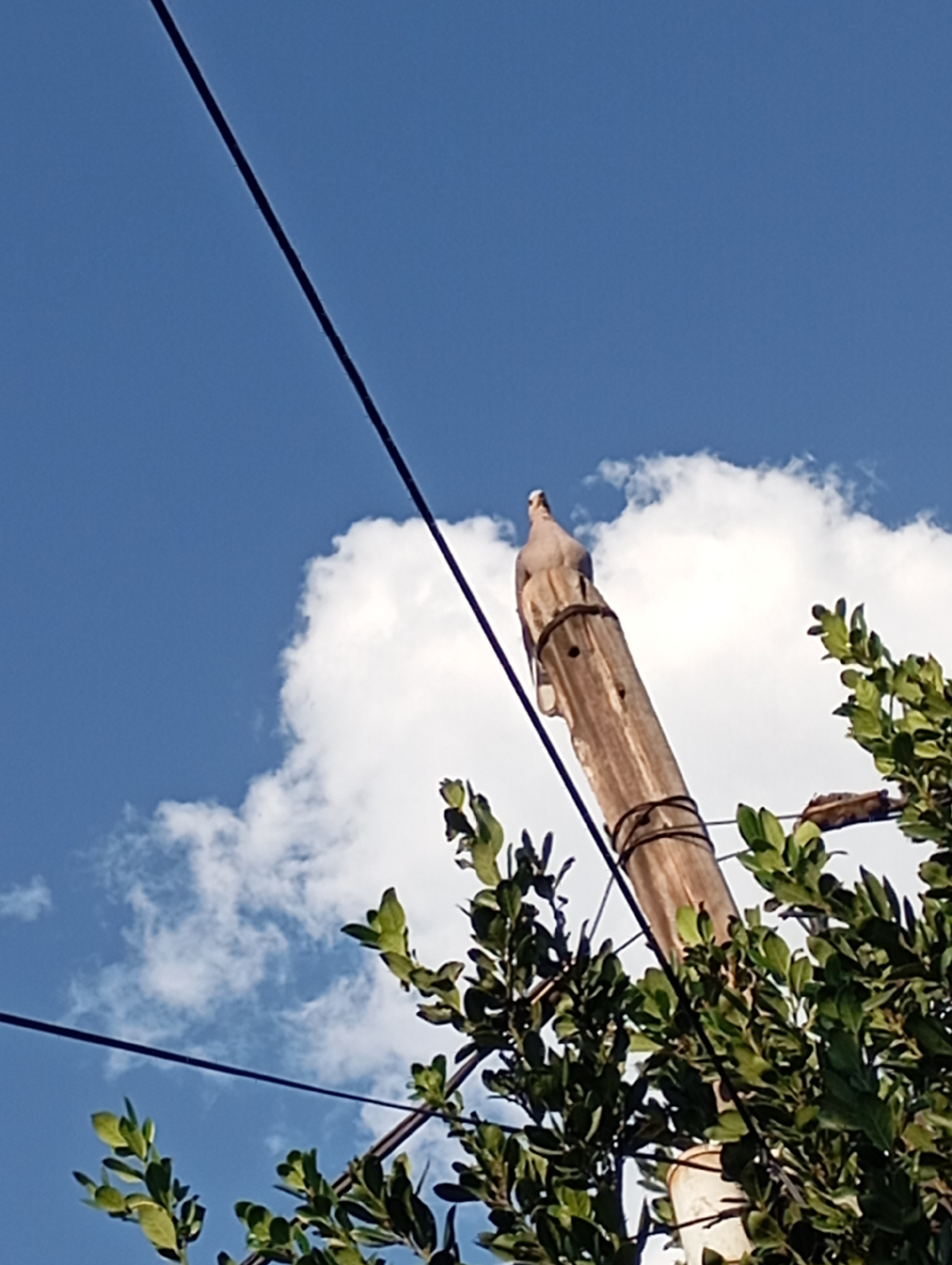 Captured from a low-angle perspective, the image portrays a dove perched atop a weathered wooden utility pole. The pole is bound by two metal straps and is intersected by black electrical wires againsβ¦read more